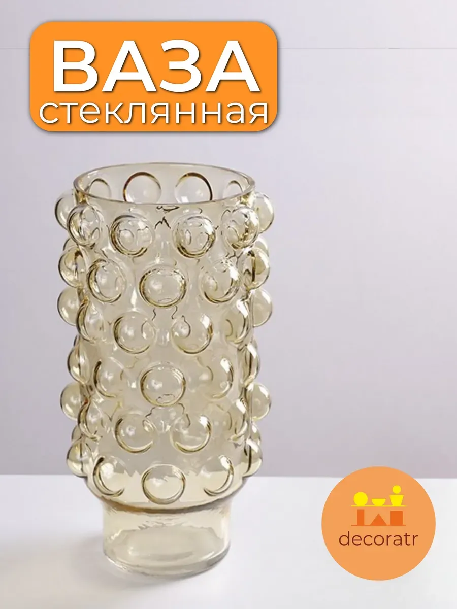 Каждый круглый элемент на поверхности словно капля утренней росы, застывшая в прозрачном янтарном стекле. Когда вы держите эту вазу в руках, чувствуете приятную прохладу гладкого стекла и удивительную игру света, которая создаёт магическую атмосферу уюта.