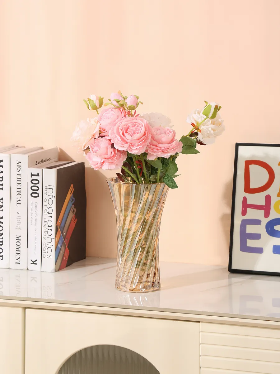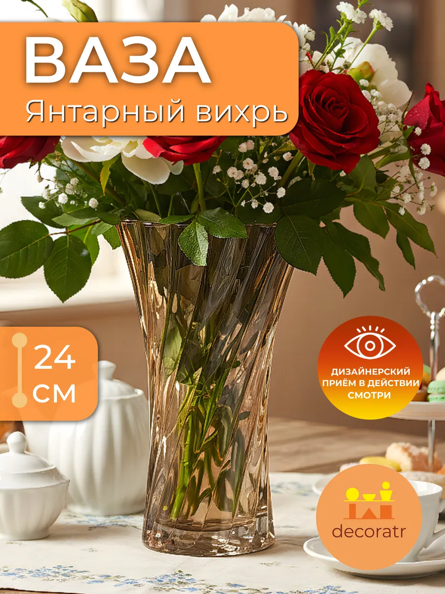 Эта интерьерная ваза для цветов словно создана из застывшего мёда и солнечного света. Каждая грань отражает тепло домашнего очага, а спиральные узоры напоминают танец осенних листьев на ветру. Deco-Decoratr представляет вам изделие, которое станет центром притяжения любого интерьера!