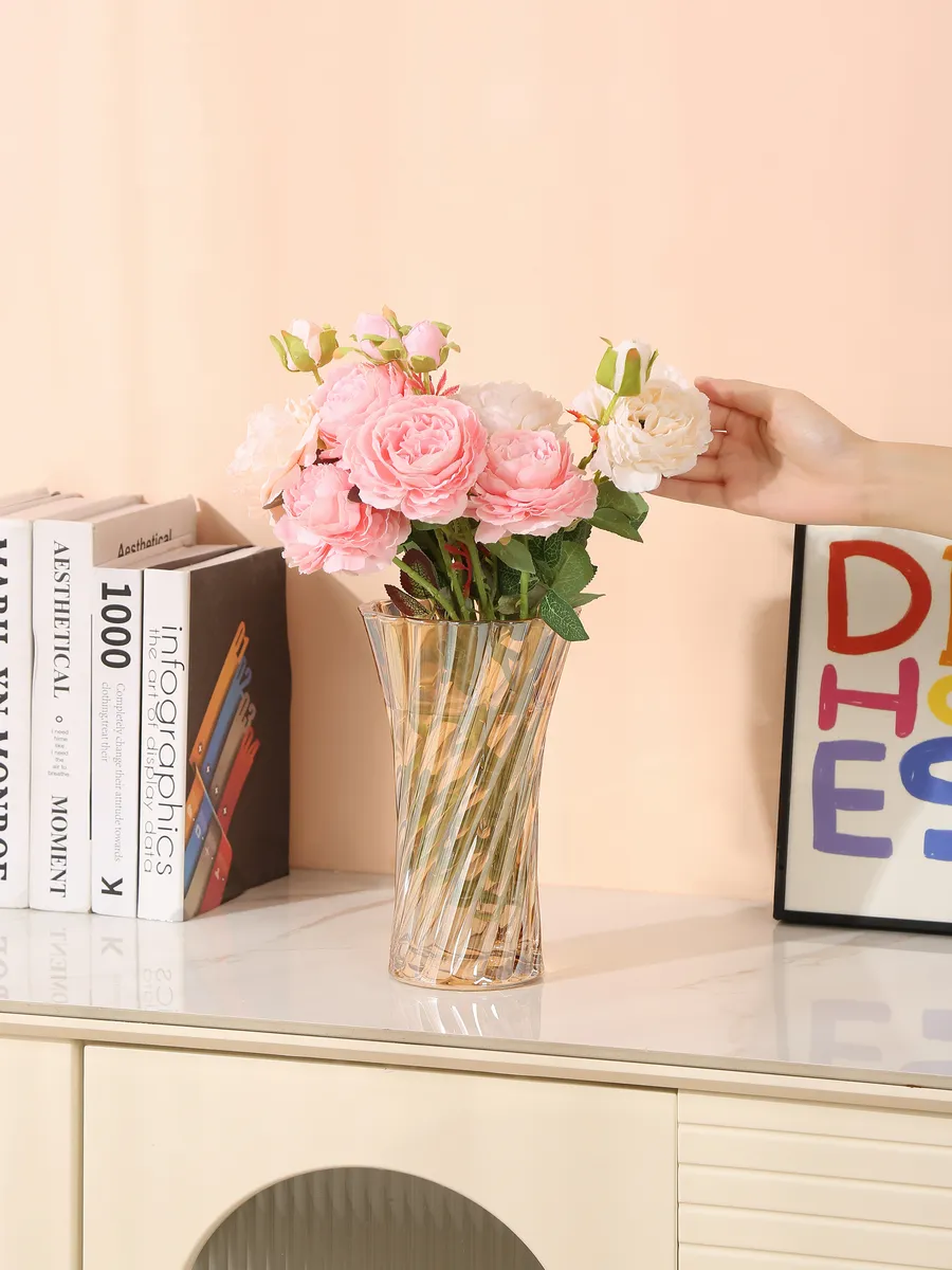 Высота 24 см делает её идеальной для букетов роз, пионов, хризантем или элегантных веток сухоцветов. Ваза напольная стеклянная такого размера прекрасно впишется как на журнальный столик, так и на комод в спальне.