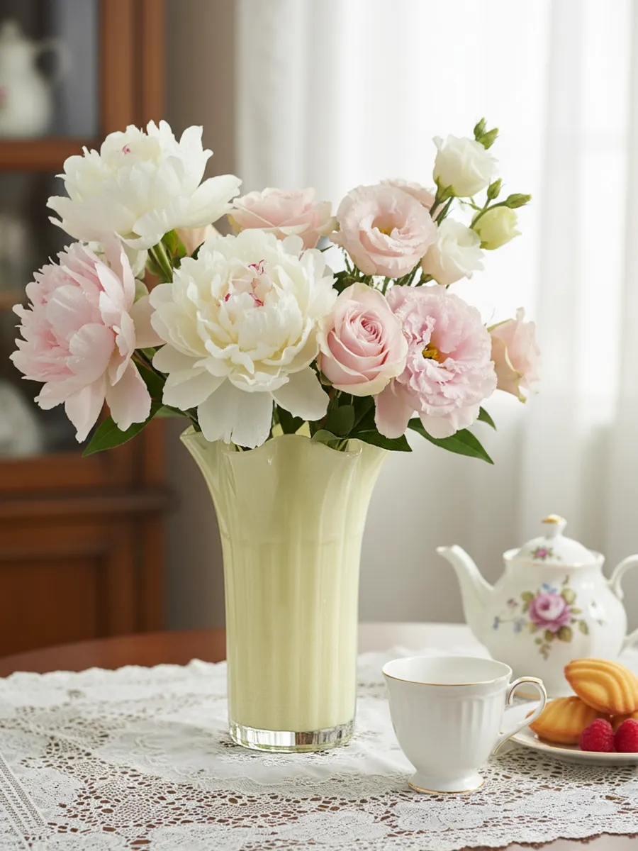 Форма: Цилиндрическая с расширением кверху, волнистые фигурные края создают эффект распустившегося цветка