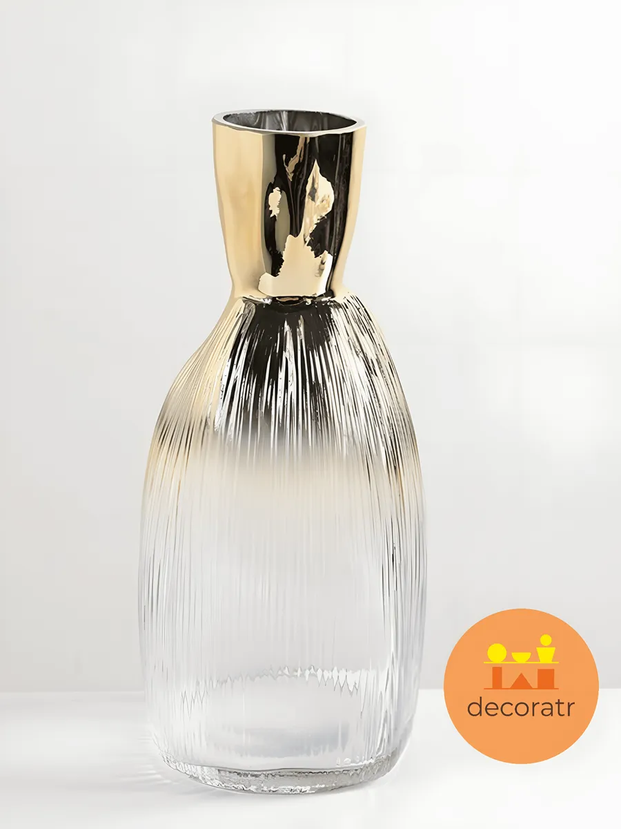 Ваза стеклянная с золотым горлышком, высокая и средняя, высота 34 см, настольная, глянцевая и прозрачная, без декора.