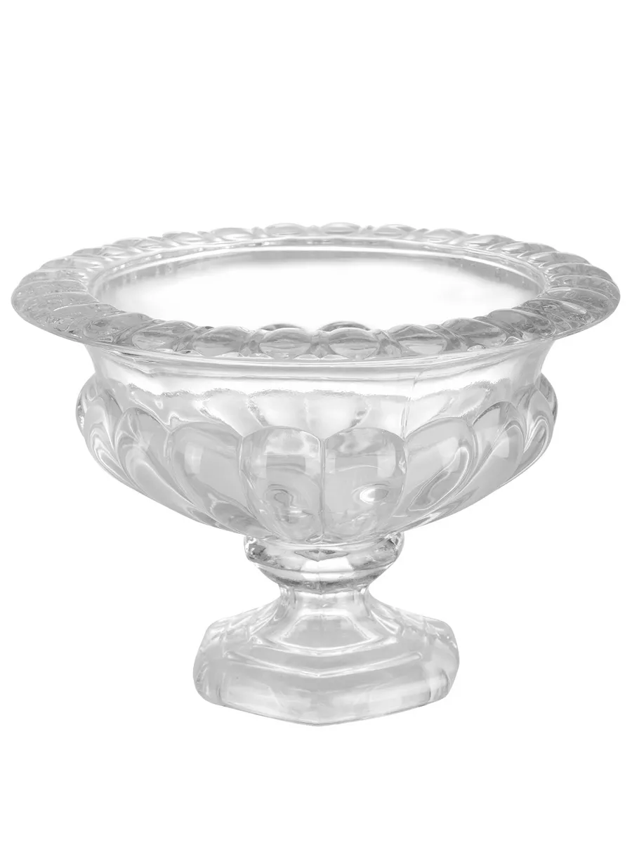 Декоративные элементы: Рельефные грани на поверхности чаши; фигурный край с волнообразным орнаментом; многоуровневая ножка с декоративными переходами.