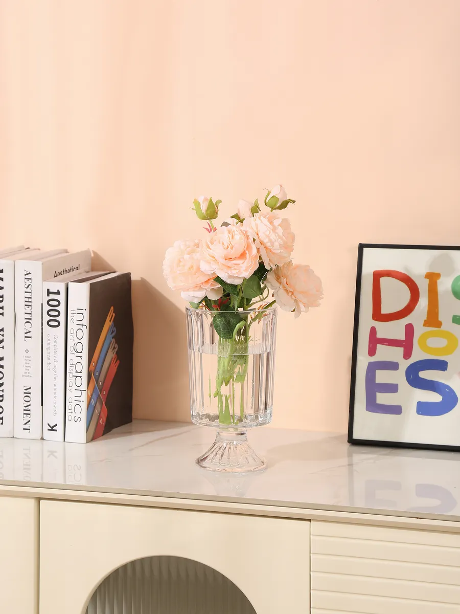 Эта стеклянная ваза для цветов на ножке воплощает в себе классическую элегантность и современную функциональность. Прозрачное стекло с рельефными вертикальными полосами создаёт удивительную игру света и тени, превращая обычный букет в произведение искусства. Именно то, что нужно для создания атмосферы торжественности!