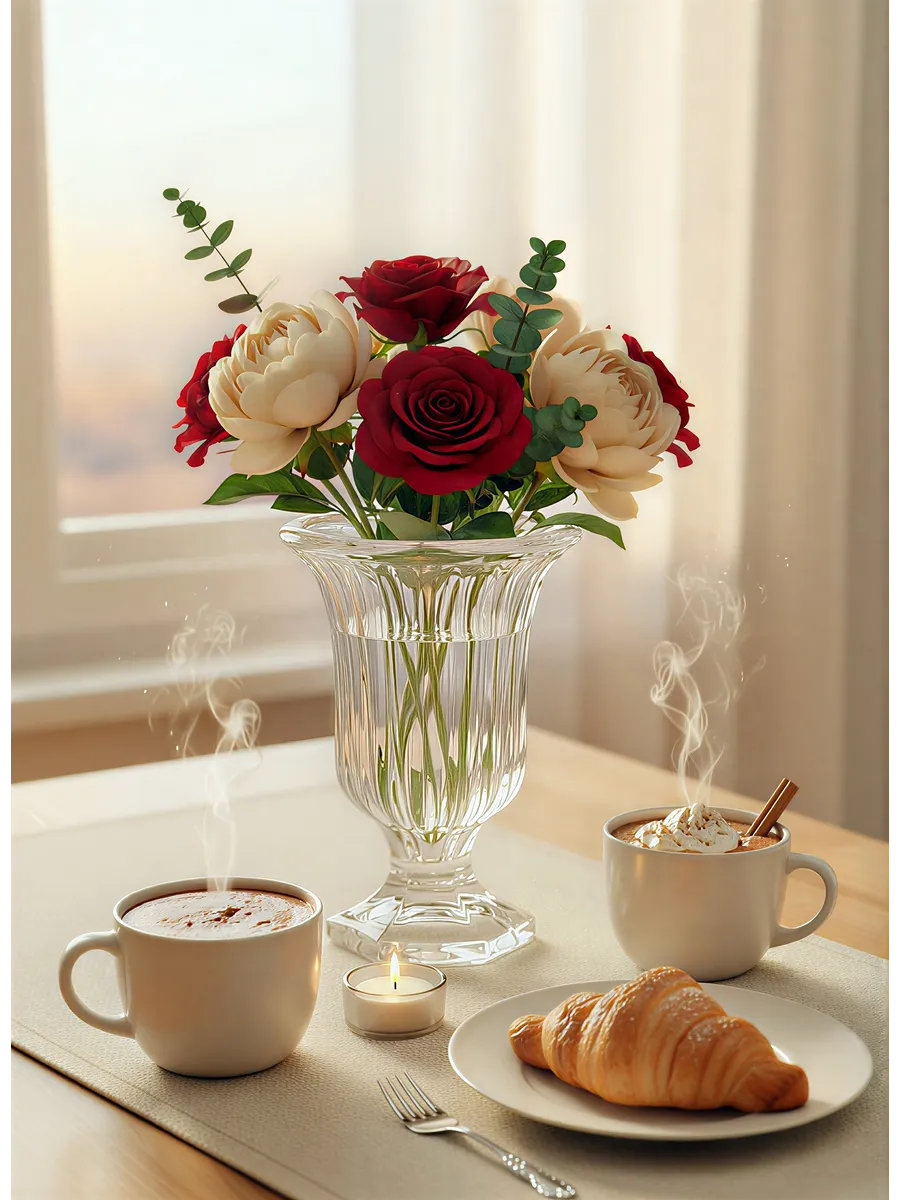 Высота 24 см делает её идеальной для букетов роз, пионов, тюльпанов или элегантных веток сухоцветов. Устойчивая круглая ножка гарантирует безопасность — даже самый пышный букет не опрокинется при случайном прикосновении!