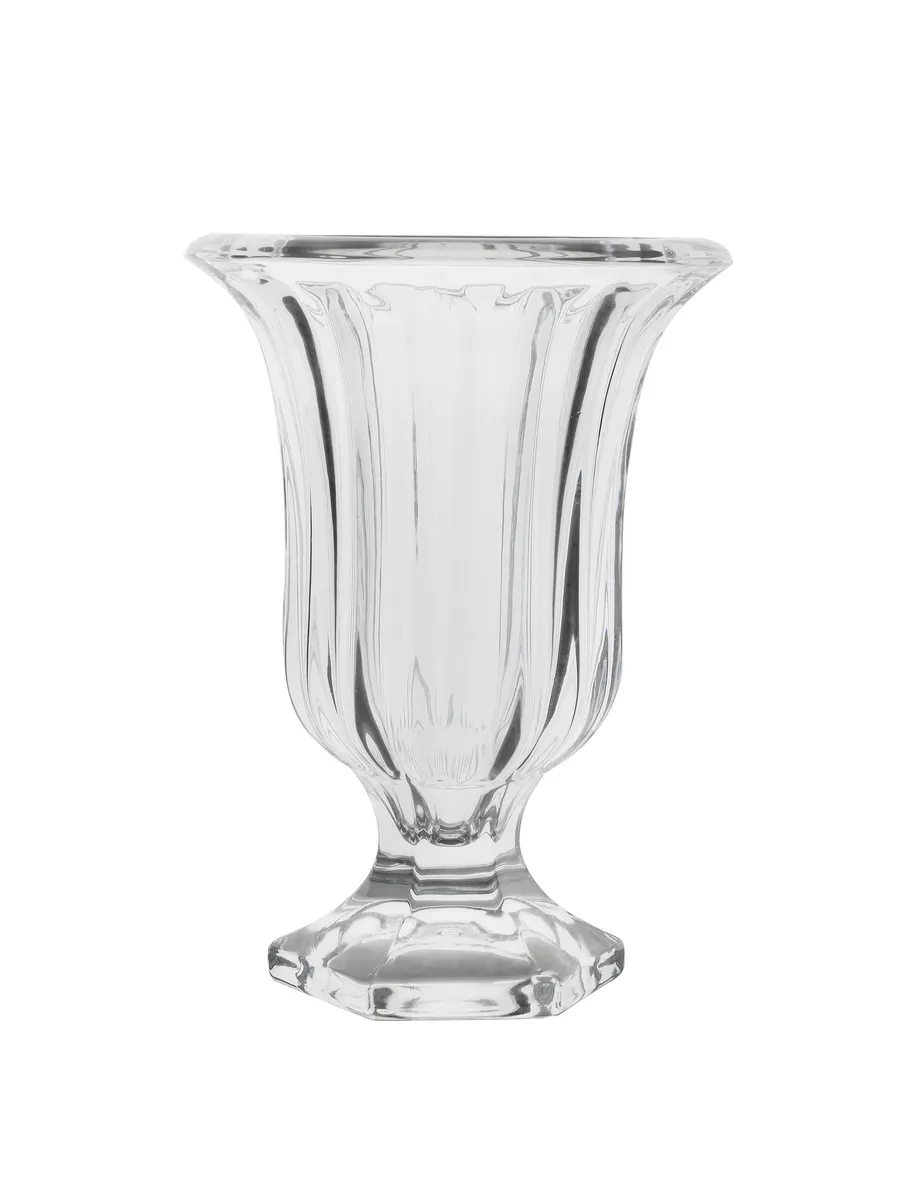 Эта великолепная ваза для цветов на высокой ножке станет настоящей жемчужиной любого интерьера. Классическая форма с рельефными вертикальными гранями напоминает старинные хрустальные изделия из дворцовых коллекций, но при этом идеально вписывается в современный дом.