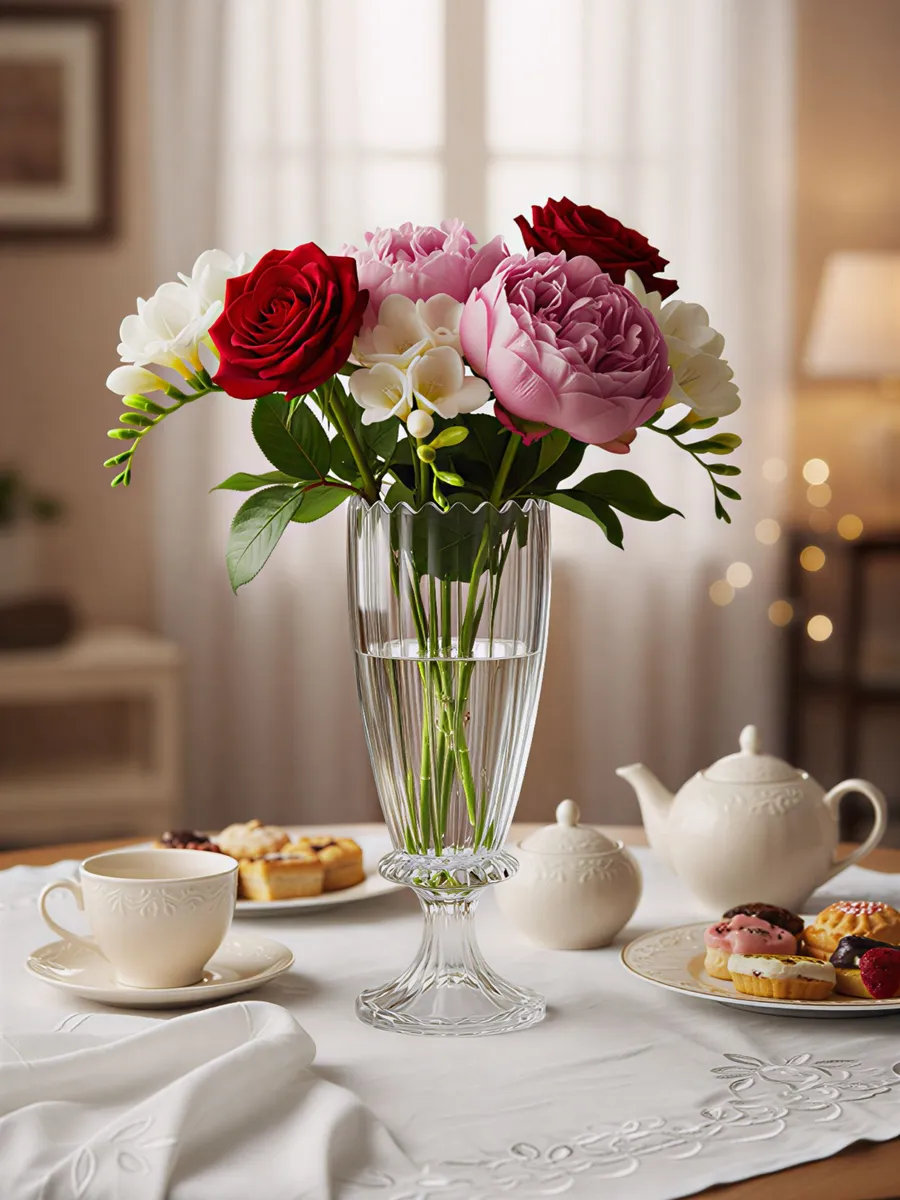 Встречайте вазу «Королевский хрусталь» высотой 30 см — настоящее произведение искусства, которое превратит любой букет в торжественную композицию! Представьте, как солнечные лучи играют в её гранёных стенках, создавая волшебные блики по всей комнате.