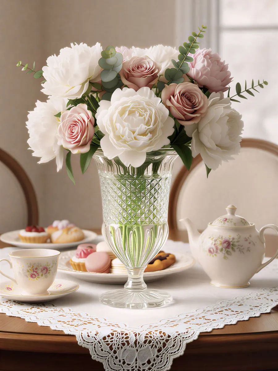 Холодная гладь хрусталя в руках дарит ощущение драгоценности, а каждый поворот открывает новые грани красоты. Эта ваза стеклянная декоративная станет изысканным акцентом в стиле арт-деко, классическом или эклектичном интерьере — её торжественная элегантность уместна везде, от гостиной до кабинета руководителя.