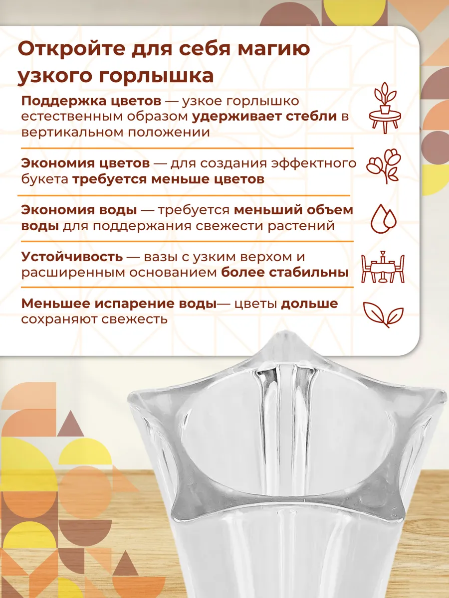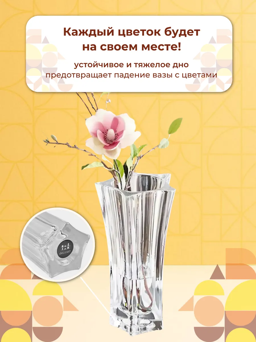 Ваза хрустальная стеклянная проста в уходе — достаточно промывать тёплой водой и протирать мягкой тканью без ворса. Толстое дно обеспечивает устойчивость даже при размещении тяжёлых букетов. Универсальная форма подходит для цветов любой длины — от коротких тюльпанов до высоких гладиолусов.