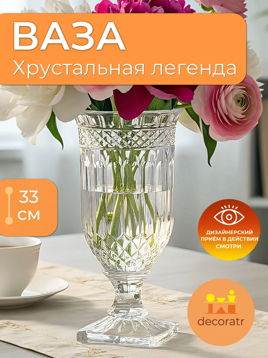 Ваза «Хрустальная Легенда» — роскошная ваза из хрустального стекла на ножке для цветов и сухоцветов, которая превратит ваш интерьер в салон эпохи Гэтсби!