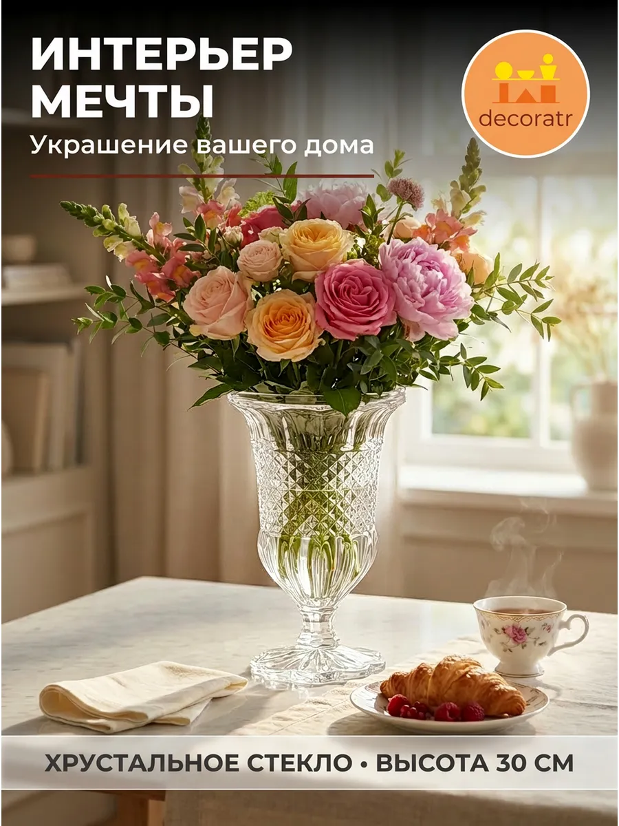 Представьте, как солнечные лучи играют в гранях этого хрустального чуда высотой 30 см! Ваза «Кристальная Роскошь» — это не просто стеклянная ваза для цветов, это настоящее произведение искусства, которое превратит ваш дом в дворец.