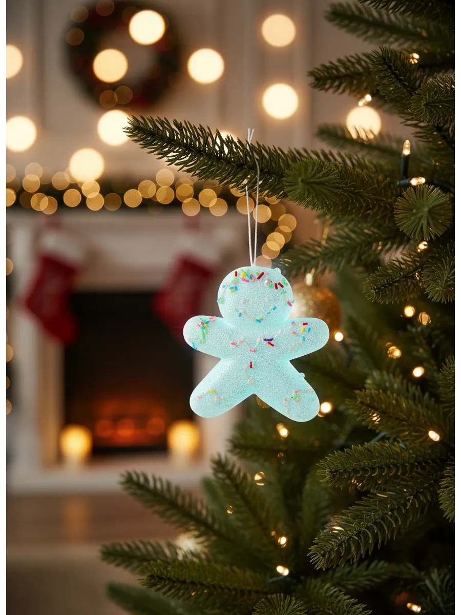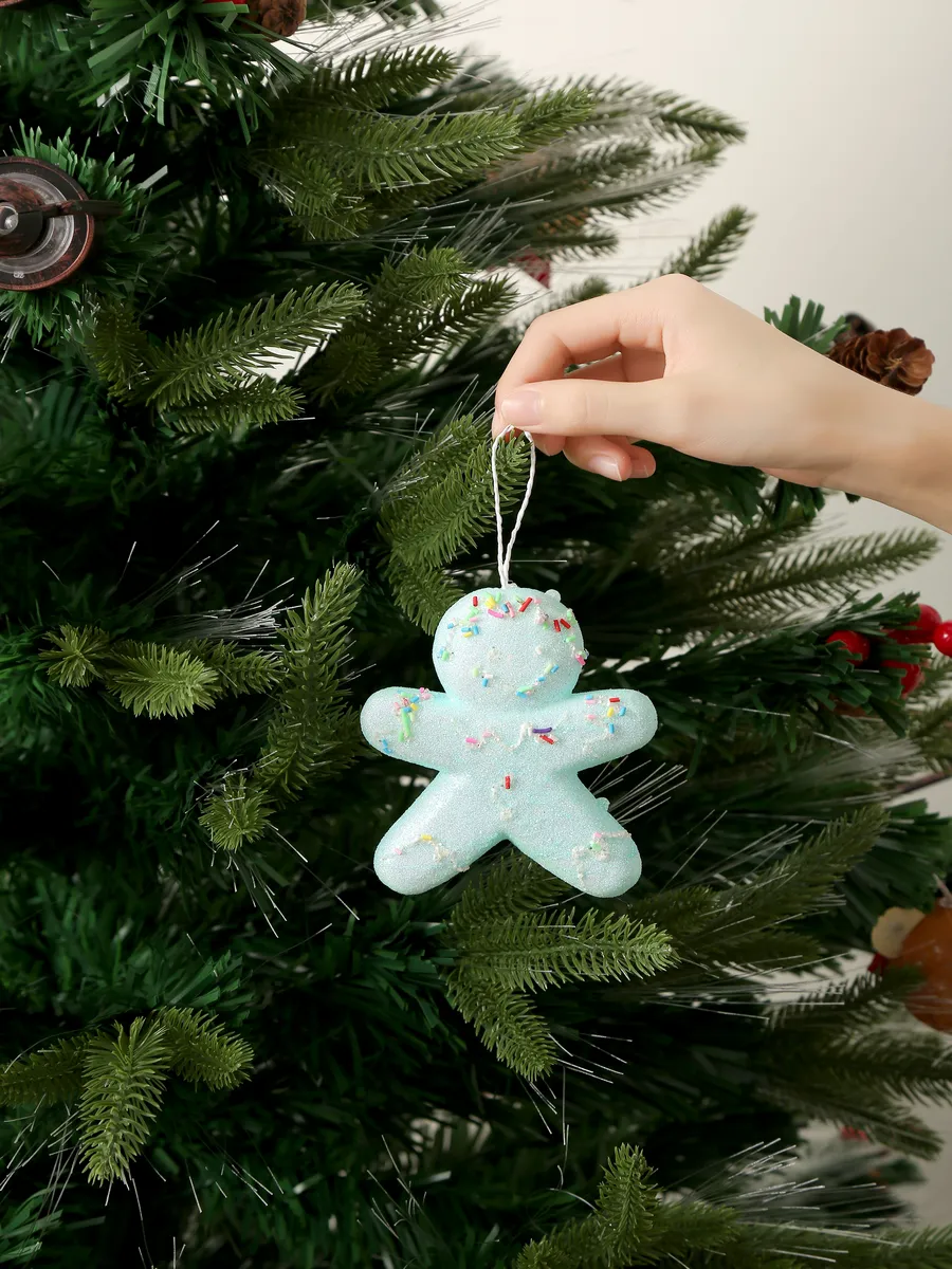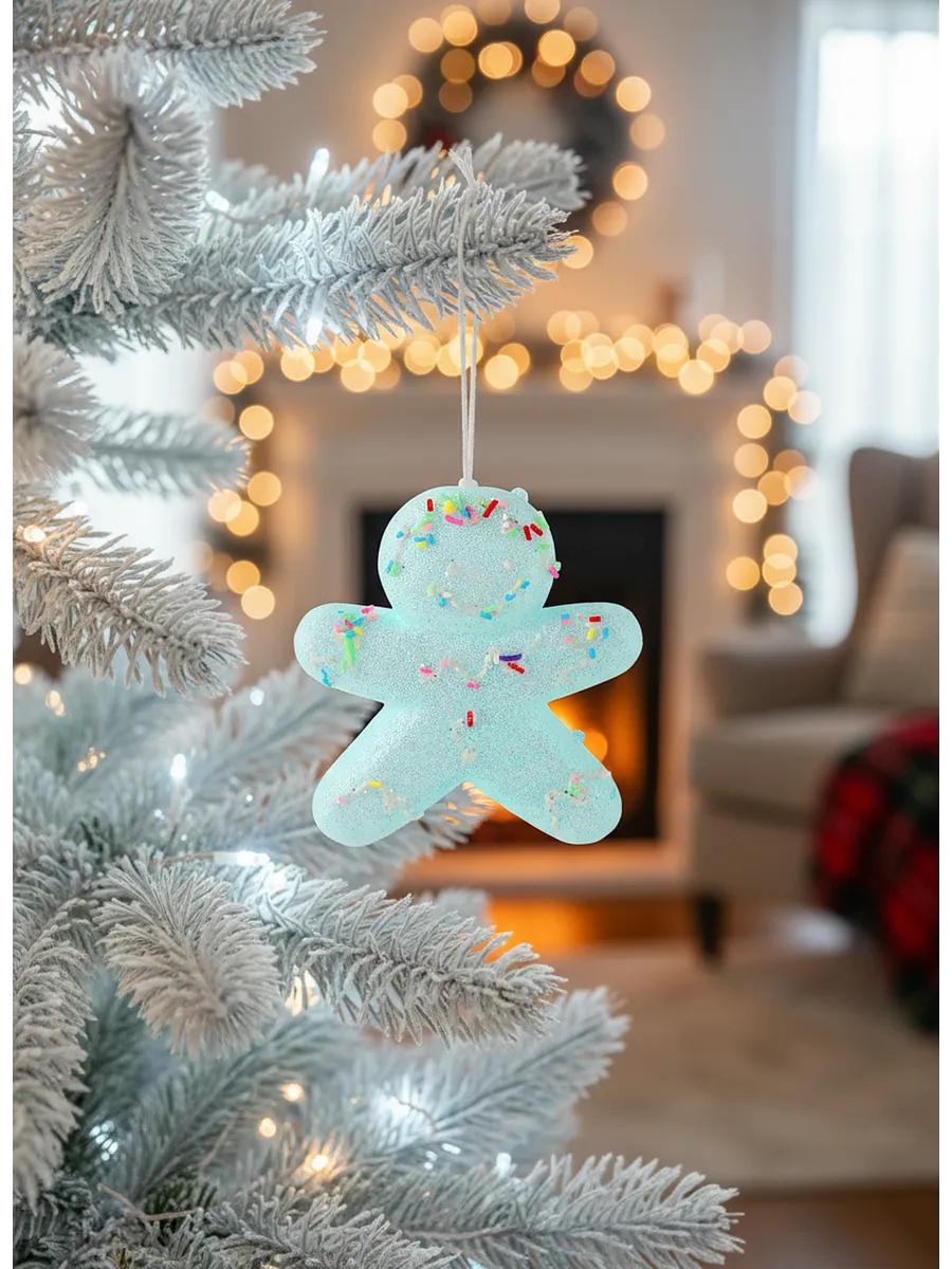 Каждый человечек словно покрыт сахарной пудрой — матовая поверхность с блестящими цветными точками напоминает настоящее имбирное печенье, присыпанное конфетти. Удобная белая петелька позволяет легко разместить украшения на любой веточке.