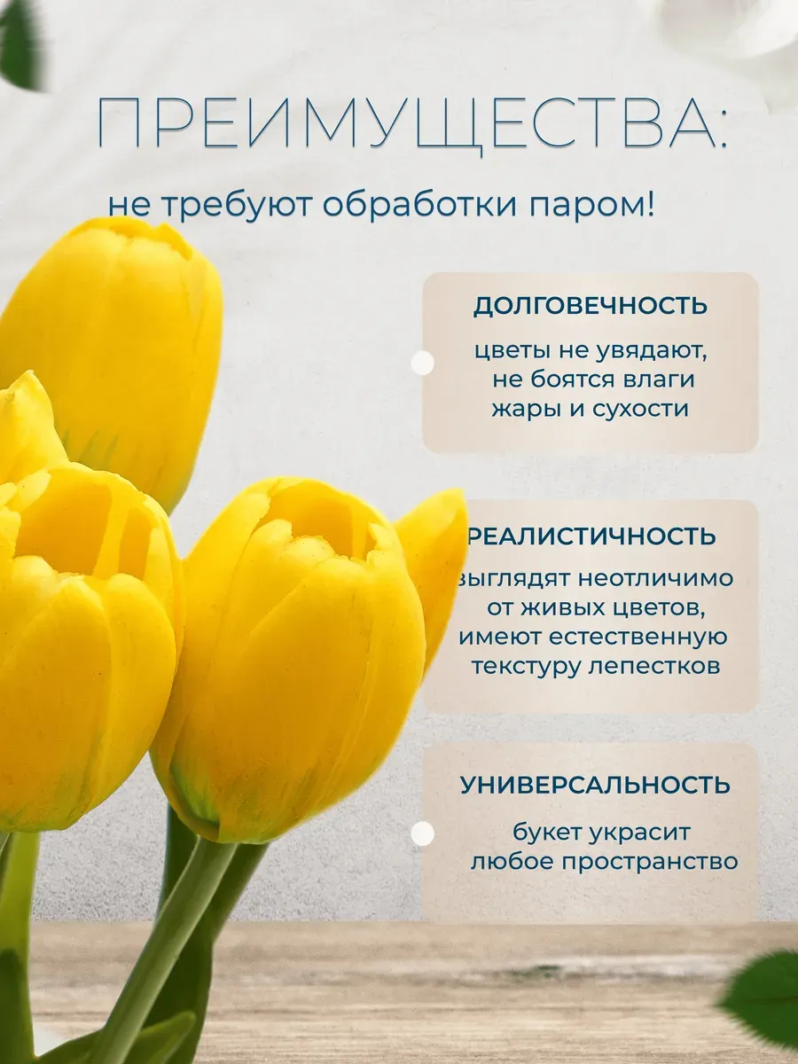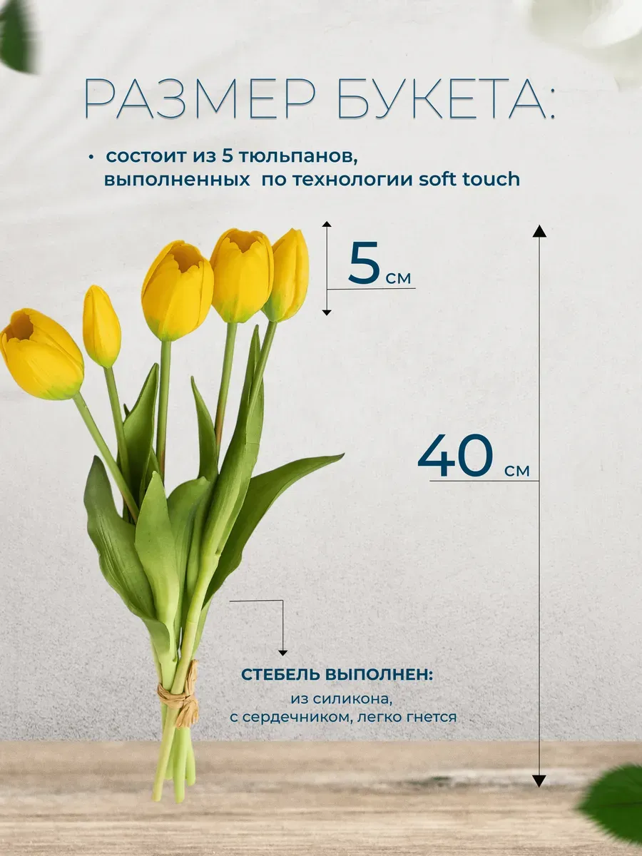 И эта красота не увянет через пару дней! Наш букет из 5 искусственных тюльпанов (40 см) – это идеальное решение для создания атмосферы праздника и уюта в любом интерьере.