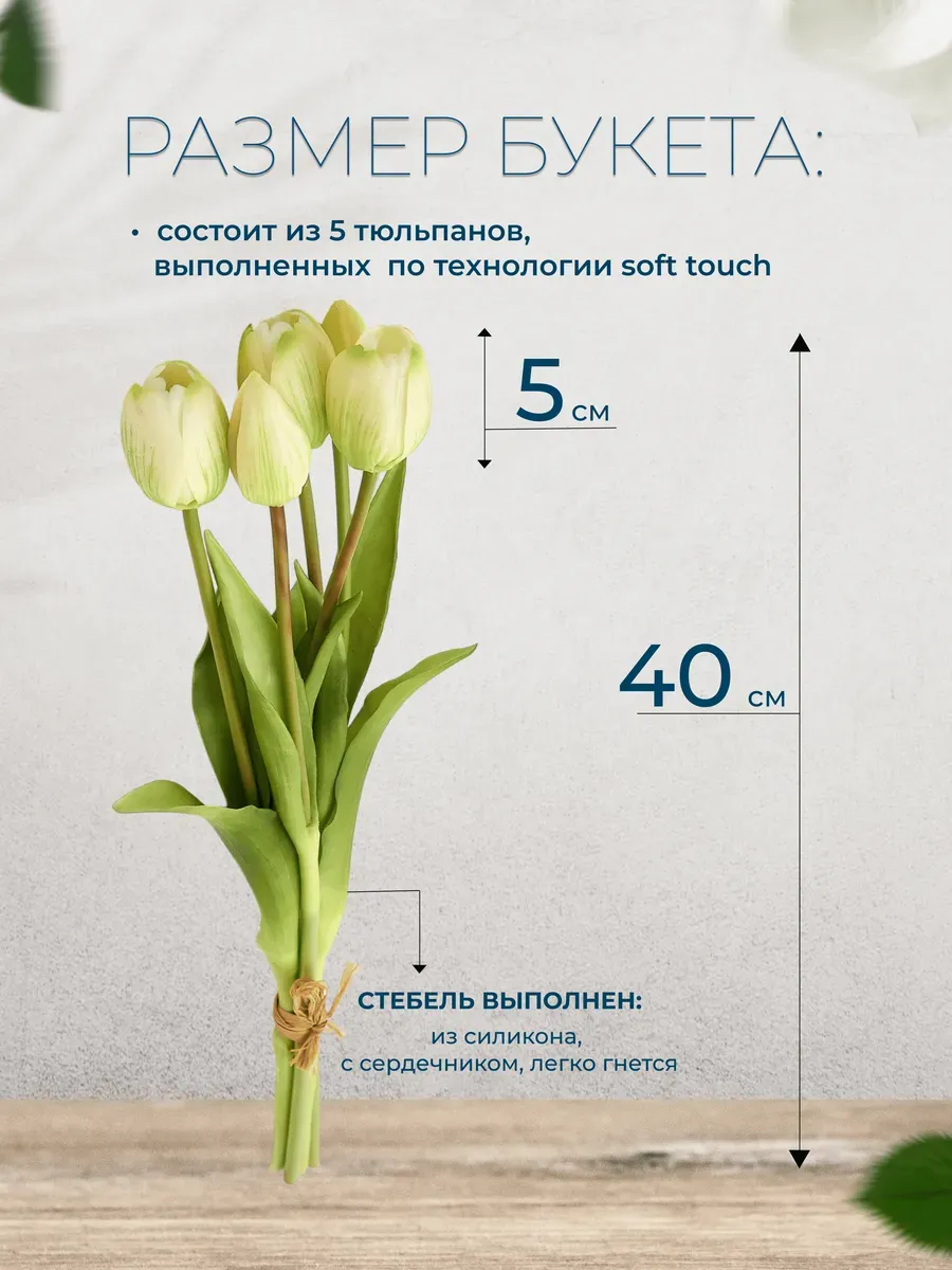 И эта красота не увянет через пару дней! Наш букет из 5 искусственных тюльпанов (40 см) – это идеальное решение для создания атмосферы праздника и уюта в любом интерьере.