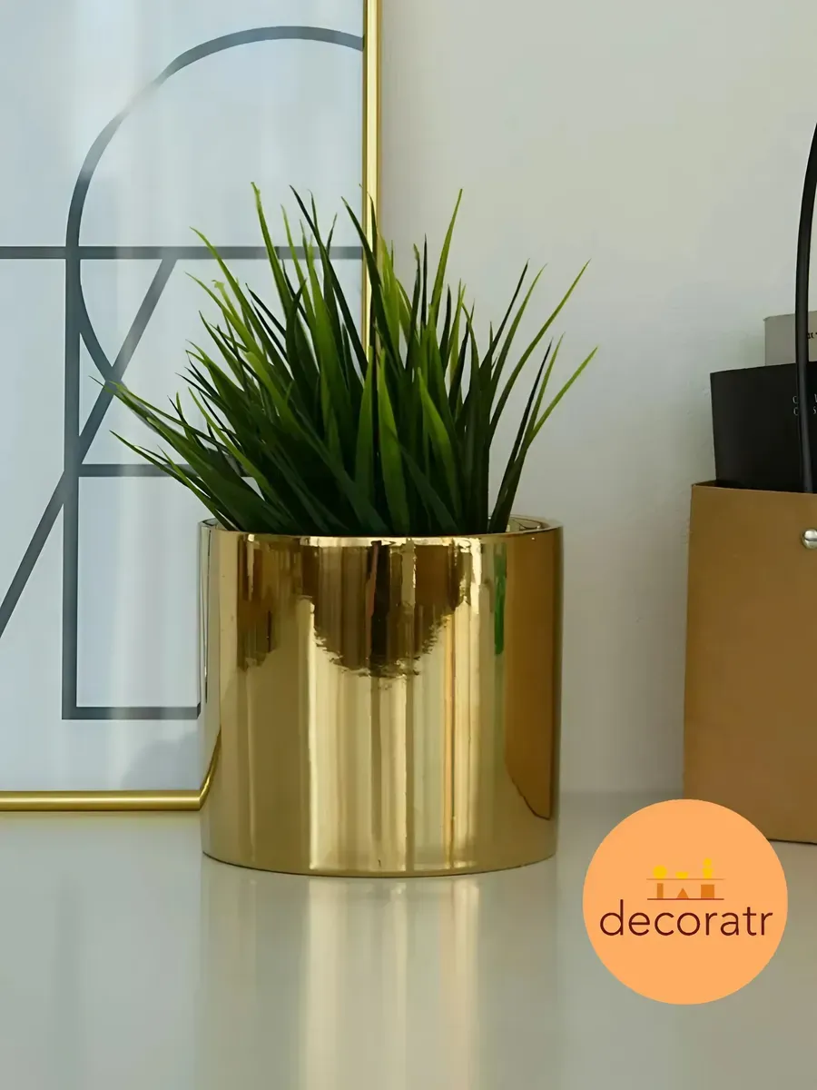 Кашпо керамическое золотое, низкое и широкое, высота 14 см, настольное, глянцевое и непрозрачное, без декора.