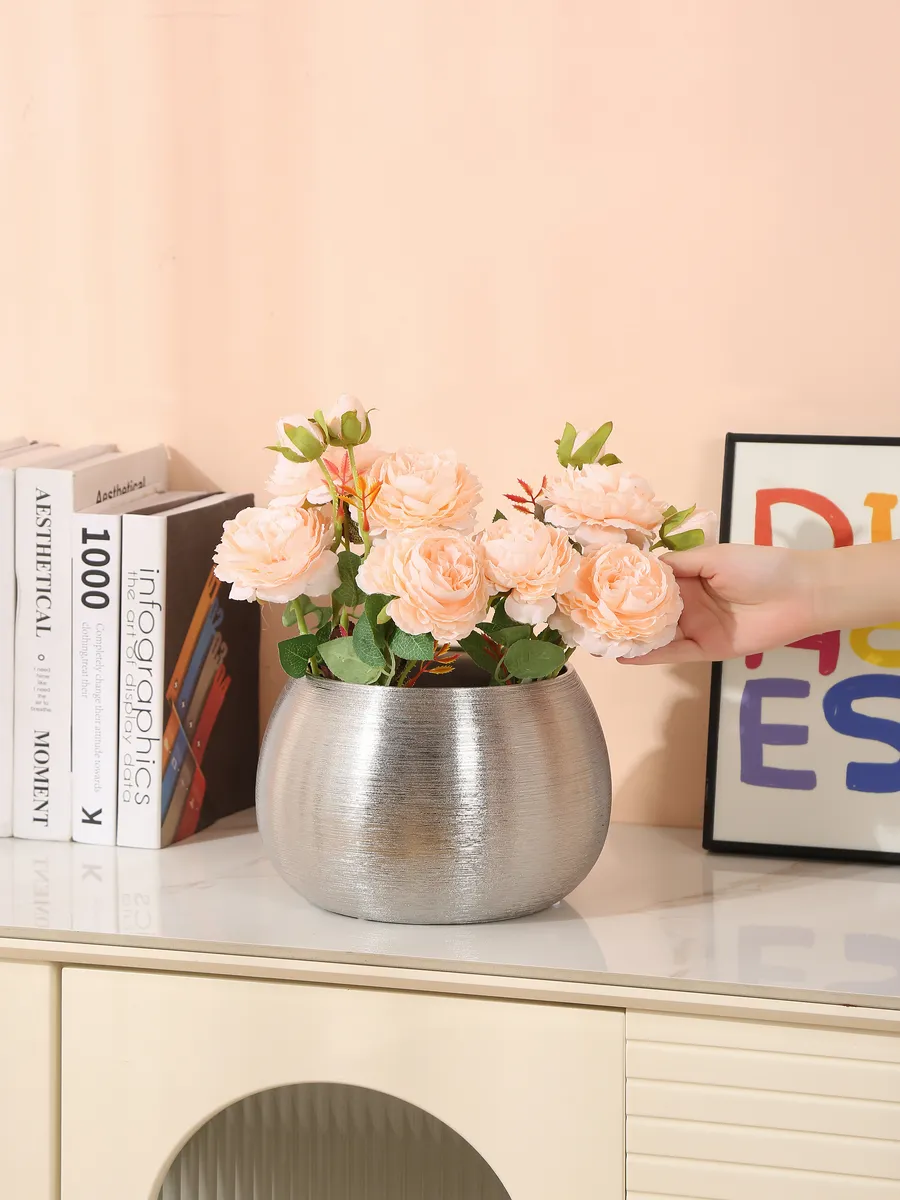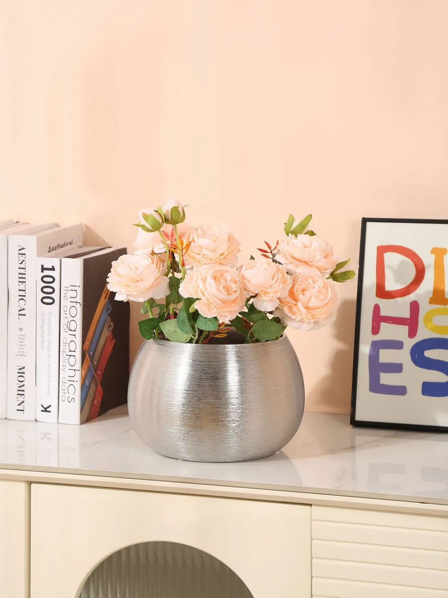 Керамические вазы для интерьера сейчас на пике популярности, но эта — особенная! Благородный серебряный оттенок с эффектом brushed metal делает её универсальным решением для любого пространства. В гостиной она станет центром композиции на журнальном столике, в спальне добавит нотку роскоши на прикроватную тумбу, а в офисе подчеркнёт ваш безупречный вкус.