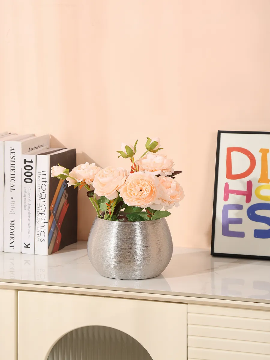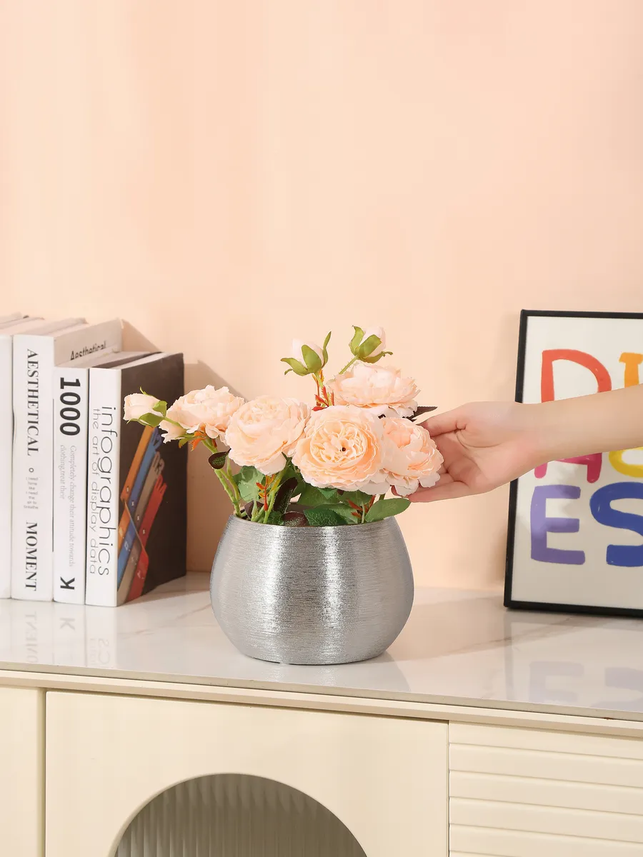 Вот это да! Взгляните на эту красавицу внимательнее. Керамическая ваза для цветов с металлическим покрытием словно соткана из лунного света. Её округлая форма идеально подходит для пышных пионов, нежных роз, весенних тюльпанов или модных сухоцветов. Благодаря оптимальной высоте в 17 см, ваши любимые цветы будут выглядеть как в лучших флористических салонах!