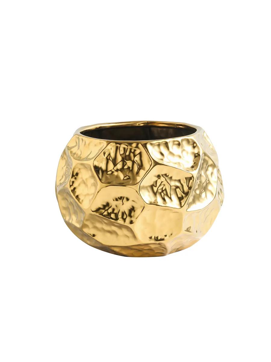 Большое кашпо 22 см идеально подходит для орхидей, суккулентов, фикусов, замиокулькаса или создания композиций из искусственных цветов. Геометрический рельеф в виде шестигранных медальонов создаёт завораживающую игру света — каждая грань отражает окружающее пространство, словно множество золотых зеркал. Это декоративное кашпо золотое станет центральным элементом в гостиной стиля арт-деко, добавит роскоши минималистичному интерьеру или подчеркнёт изысканность классического декора.