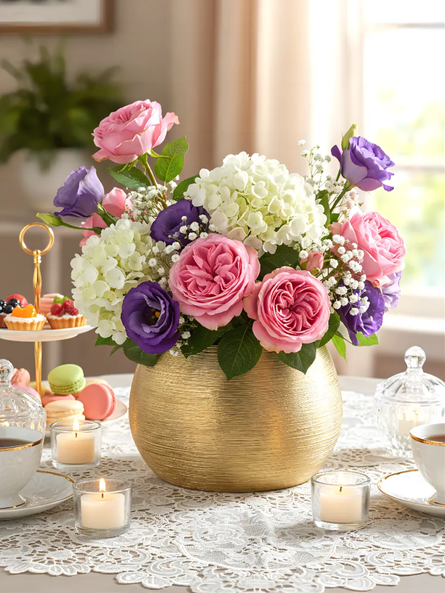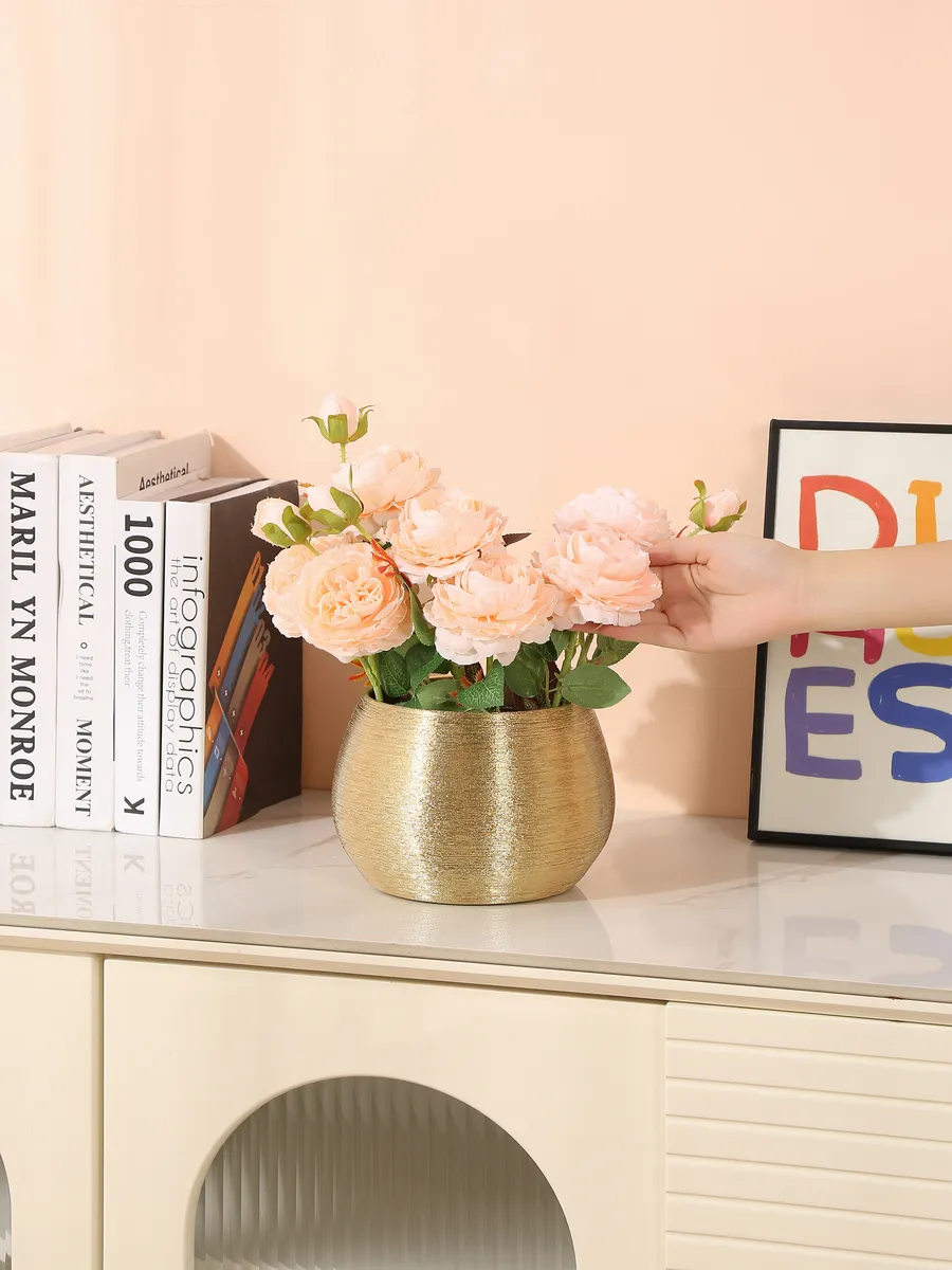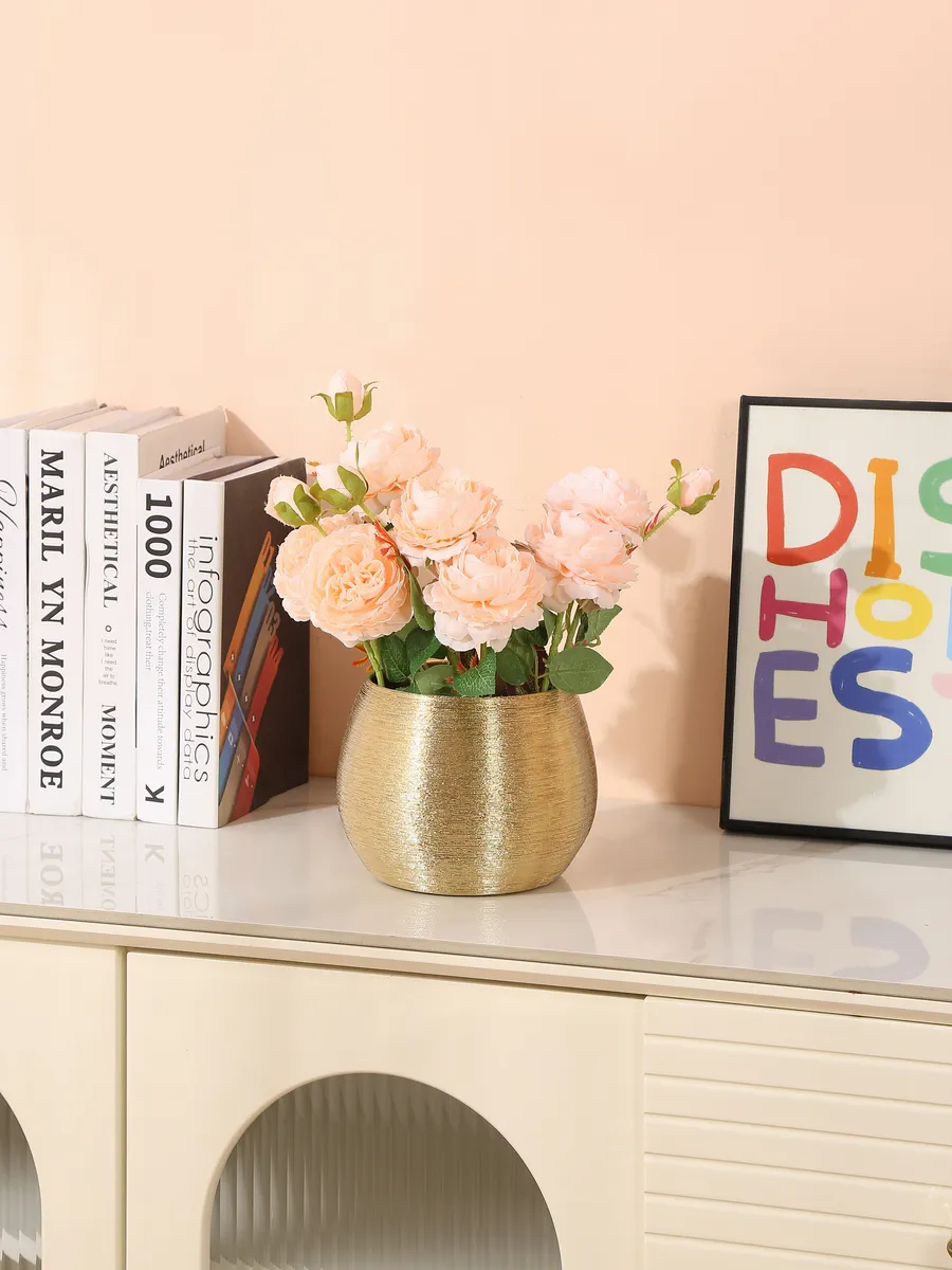 Практичность? Безусловно! Керамическая основа обеспечивает устойчивость — ваш букет останется в безопасности даже при случайном касании. Уход элементарный: достаточно протереть влажной тканью, и ваза вновь засияет как новая. Универсальный золотой оттенок гармонирует с любой цветовой палитрой интерьера.