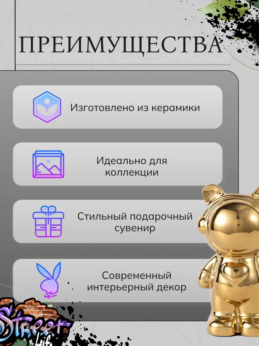 Представляем Вам коллекционную статуэтку-копилку, которая станет ярким украшением вашей комнаты и великолепным способом накопления финансов. Эта дизайнерская фигурка Bearbrick объединяет в себе функциональность и искусство, идеально подходя для ценителей современного дизайна и коллекционеров.Особенности товара: • Исключительный дизайн: статуэтка в форме космонавта – это современное произведение искусства. Ее структура и дизайн выразительно сочетают в себе минимализм, что делает ее идеальным акцентом в любом интерьере. • Копилка: Не только красивая, но и функциональная. Космонавт Беарбрик имеет специальный отсек, который позволяет вам копить деньги. Это отличный способ мотивировать себя на достижение финансовых целей. • Отличный подарок: статуэтка — это отличный подарок для друзей, семьи или коллег. Она будет радовать владельца не только красотой, но и возможностью накопления средств.Благодаря своему неповторимому дизайну, крутые статуэтки Бербрик приобрели колоссальную популярность, их коллекционируют, используют для декора дома и офиса. Интерьерная фигурка выполнена из керамики с качественным цветным покрытием. Она может стать оригинальным подарком ценителю фэшн стиля: Стильная керамическая статуэтка украсит тату-салон, студию красоты и барбершоп, а так же привлечет всеобщее внимание на рабочем столе в офисе. Фигурка Kaws покорит Ваше сердце!Фигурки Барбрик бережно упакованы в коробки, поэтому идеально подойдут на Новый год, в качестве подарка или же дизайнерского решения. День рождения, 23 февраля, 8 марта! Будьте осторожны, данная покупка является зависимостью в сборе целой коллекции!