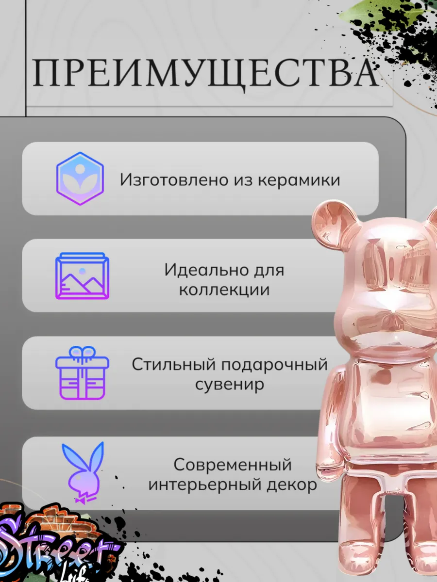 Представляем Вам коллекционную статуэтку-копилку, которая станет ярким украшением вашей комнаты и великолепным способом накопления финансов. Эта дизайнерская фигурка Bearbrick объединяет в себе функциональность и искусство, идеально подходя для ценителей современного дизайна и коллекционеров.Особенности товара: • Исключительный дизайн: статуэтка в форме мишки – это современное произведение искусства. Ее структура и дизайн выразительно сочетают в себе минимализм, что делает ее идеальным акцентом в любом интерьере. • Копилка: Не только красивая, но и функциональная. Мишка Беарбрик имеет специальный отсек, который позволяет вам копить деньги. Это отличный способ мотивировать себя на достижение финансовых целей. • Отличный подарок: статуэтка — это отличный подарок для друзей, семьи или коллег. Она будет радовать владельца не только красотой, но и возможностью накопления средств.Благодаря своему неповторимому дизайну, крутые статуэтки Бербрик приобрели колоссальную популярность, их коллекционируют, используют для декора дома и офиса. Интерьерная фигурка выполнена из керамики с качественным цветным покрытием. Она может стать оригинальным подарком ценителю фэшн стиля: Стильная керамическая статуэтка украсит тату-салон, студию красоты и барбершоп, а так же привлечет всеобщее внимание на рабочем столе в офисе. Фигурка Kaws покорит Ваше сердце!Фигурки Барбрик бережно упакованы в коробки, поэтому идеально подойдут на Новый год 2024, в качестве подарка или же дизайнерского решения. День рождения, 23 февраля, 8 марта! Будьте осторожны, данная покупка является зависимостью в сборе целой коллекции!