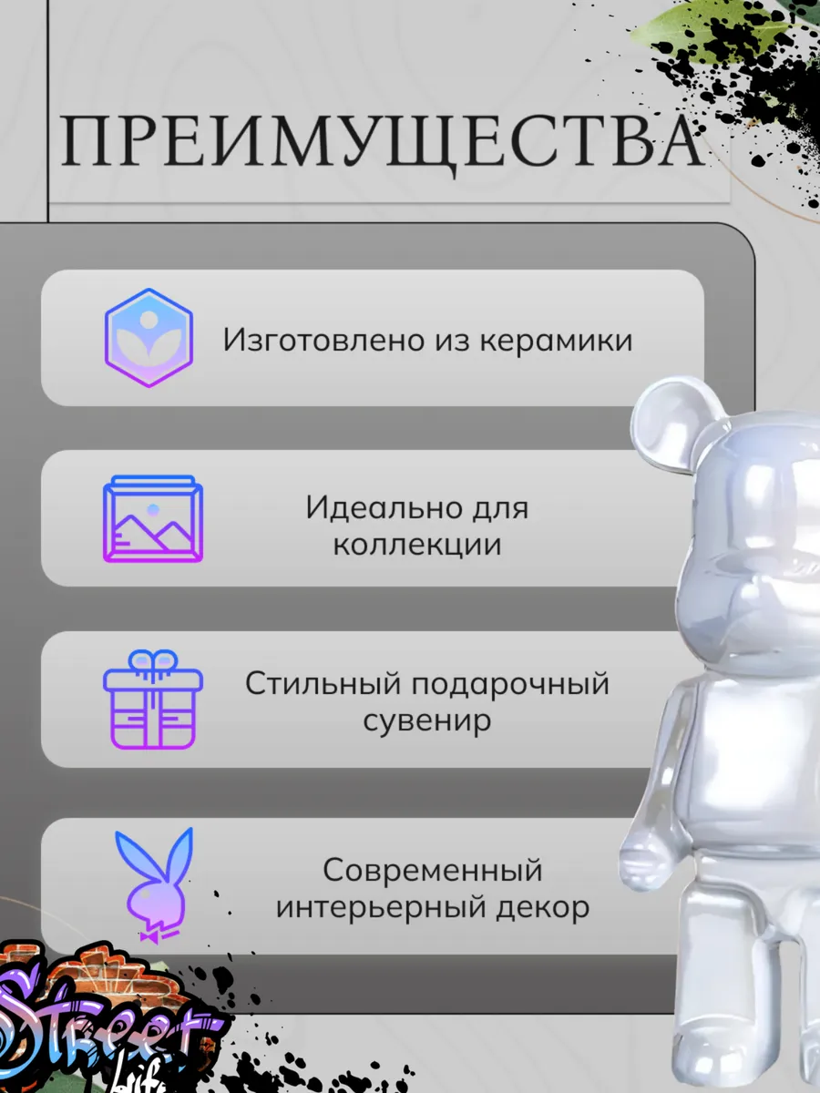 Представляем Вам коллекционную статуэтку, которая станет ярким украшением вашей комнаты. Эта дизайнерская фигурка Bearbrick объединяет в себе функциональность и искусство, идеально подходя для ценителей современного дизайна и коллекционеров.Особенности товара: • Исключительный дизайн: статуэтка в форме мишки Беарбрик – это современное произведение искусства. Ее структура и дизайн выразительно сочетают в себе минимализм, что делает ее идеальным акцентом в любом интерьере. Отличный подарок: статуэтка медведь — это отличный подарок для друзей, семьи или коллег. Благодаря своему неповторимому дизайну, крутые статуэтки Бербрик приобрели колоссальную популярность, их коллекционируют, используют для декора дома и офиса. Интерьерная фигурка выполнена из керамики с качественным цветным покрытием. Она может стать оригинальным подарком ценителю фэшн стиля: Стильная керамическая статуэтка украсит тату-салон, студию красоты и барбершоп, а так же привлечет всеобщее внимание на рабочем столе в офисе. Фигурка Kaws покорит Ваше сердце!Фигурки Барбрик бережно упакованы в коробки, поэтому идеально подойдут на Новый год, в качестве подарка или же дизайнерского решения. День рождения, 23 февраля, 8 марта! Будьте осторожны, данная покупка является зависимостью в сборе целой коллекции!