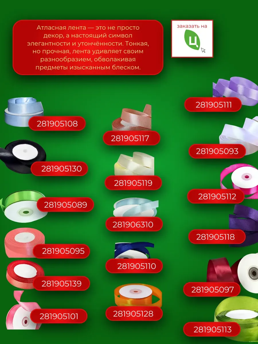 Атласная лента — это не просто декор, а настоящий символ элегантности и утончённости. Тонкая, но прочная, лента удивляет своим разнообразием, обволакивая предметы изысканным блеском. Насыщенный, стойкий цвет делает атласную ленту 2 см непревзойдённым выбором для оформления: от свадебных букетов до новогодних декораций.