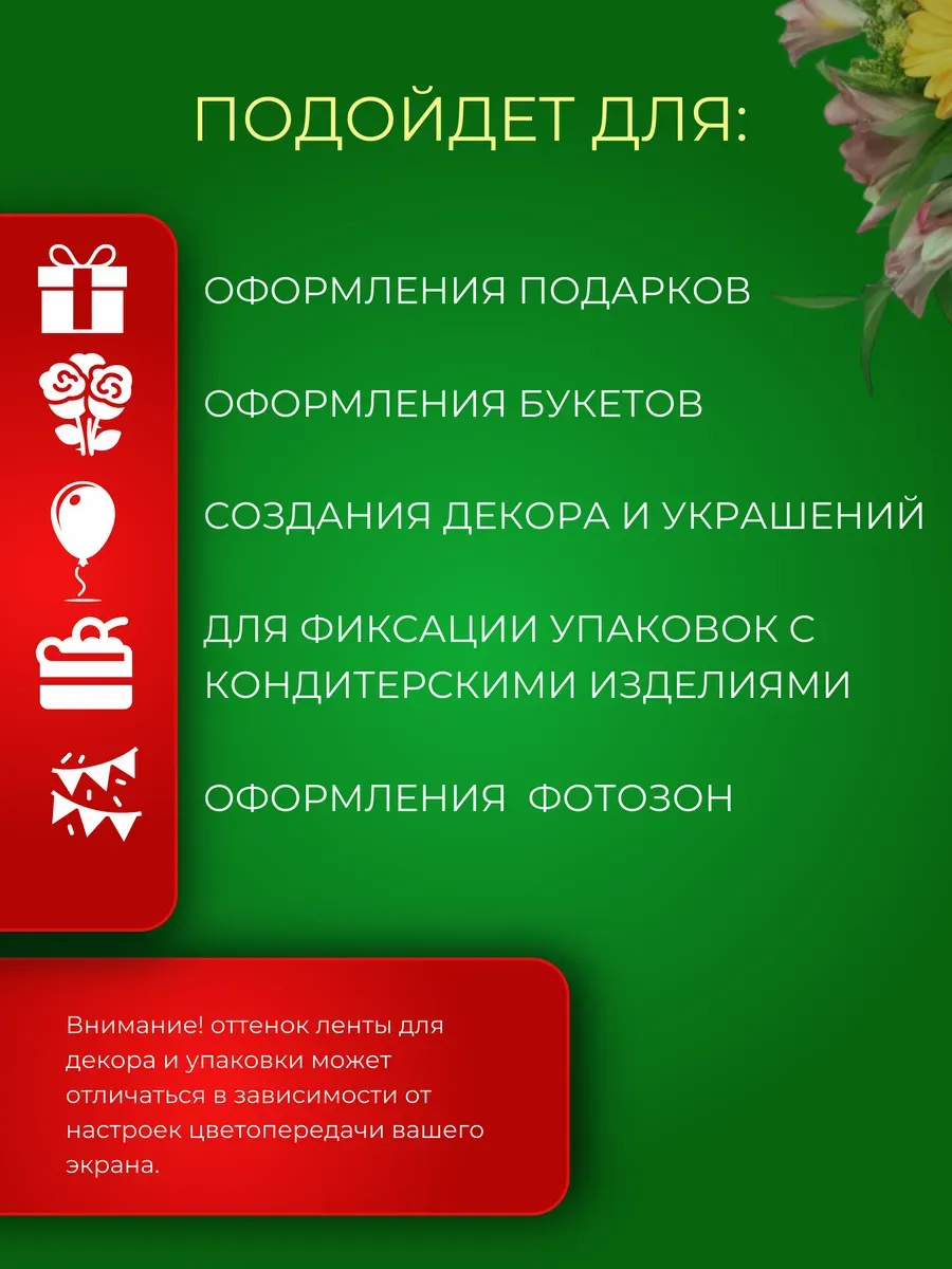 Лента для подарков и букетов сохраняет цвет при контакте с водой, не линяет на светлые цветы.