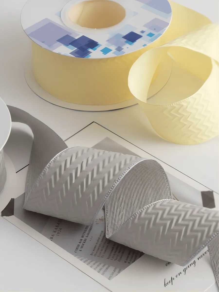 Рельефное плетение «ёлочка» создаёт игру света на поверхности — букет выглядит дороже без дополнительного декора. Лента декоративная не скользит в руках благодаря фактурной поверхности, что критично при работе с тяжёлыми композициями от 2 кг.