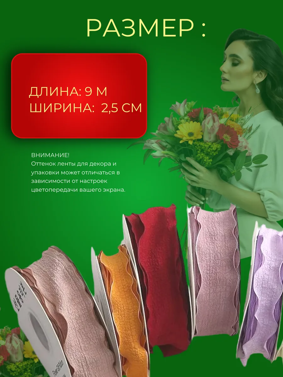Размер 2,5 см×9 м, полиэстер с органзой: эта лента для букетов создаёт воздушный объём благодаря фигурному краю с мягкой волной. Нежный оттенок идеально сочетается с белыми розами и эустомой.