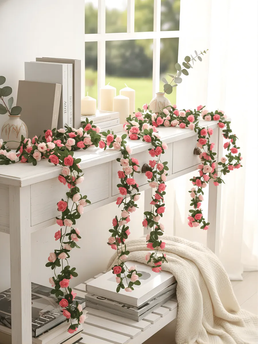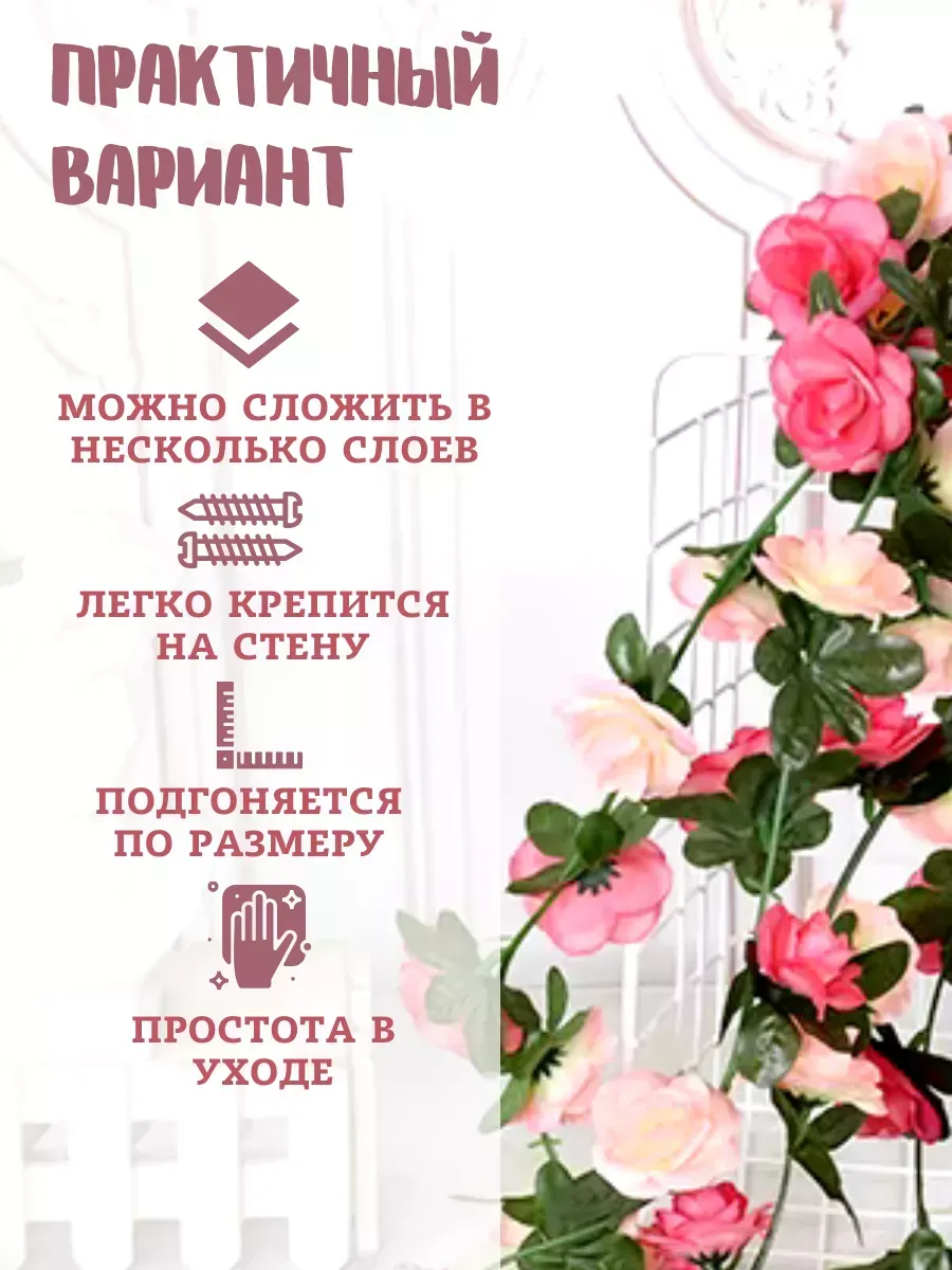 Искусственные розы гирлянда в наборе из 2 штук — это готовое решение для масштабного декора. Эти декоративные лианы с розами в нежных оттенках от кремово-белого до насыщенно-розового создают эффект живой изгороди прямо в вашем интерьере. С двумя лианами по 230 см вы можете оформить полноценную свадебную арку, создать симметричную композицию по обе стороны зеркала, украсить всю стену в фотозоне или сплести роскошный цветочный балдахин над кроватью — искусственная гирлянда из цветов в комплекте даёт безграничные возможности для творчества.