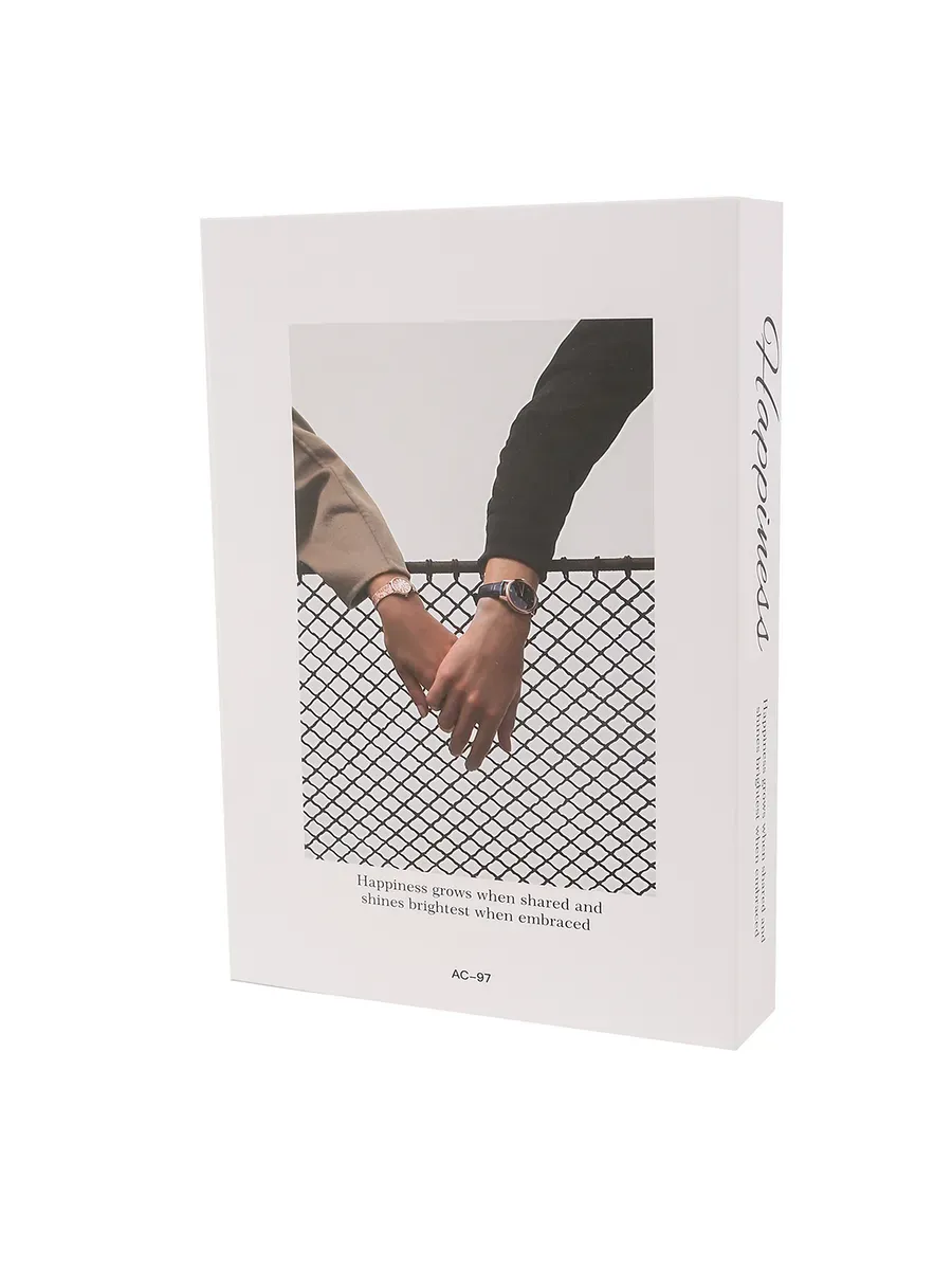 Этот стильный декоративный муляж книги выполнен из качественного картона и поражает своим современным дизайном. На обложке — трогательное изображение переплетённых рук на фоне геометрического узора в чёрно-белых тонах. Надпись «Happiness grows when shared and shines brightest when embraced» превращает обычный предмет декора в философское послание о том, что счастье растёт, когда им делишься.