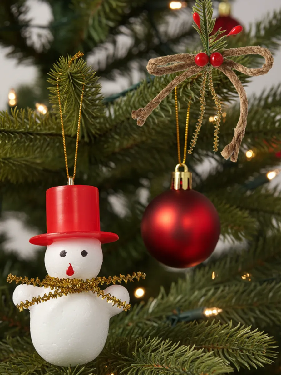 Глянцевое покрытие шаров; золотистая мишура на снеговиках; красные ягодки на бантах