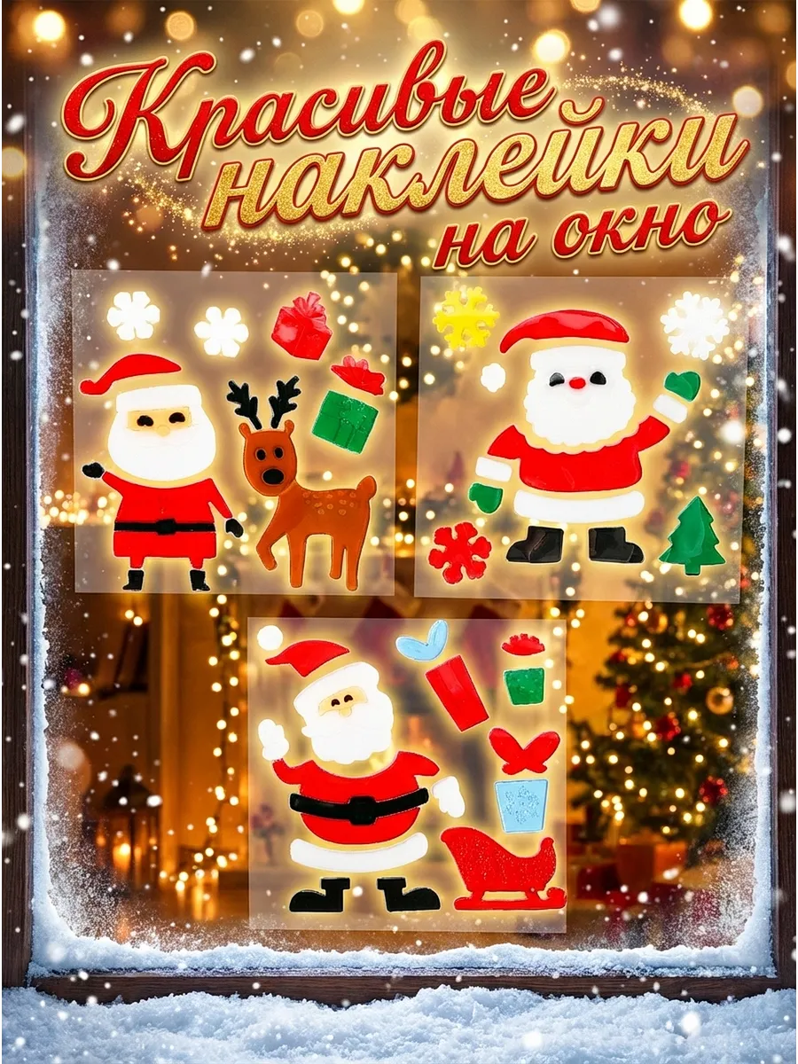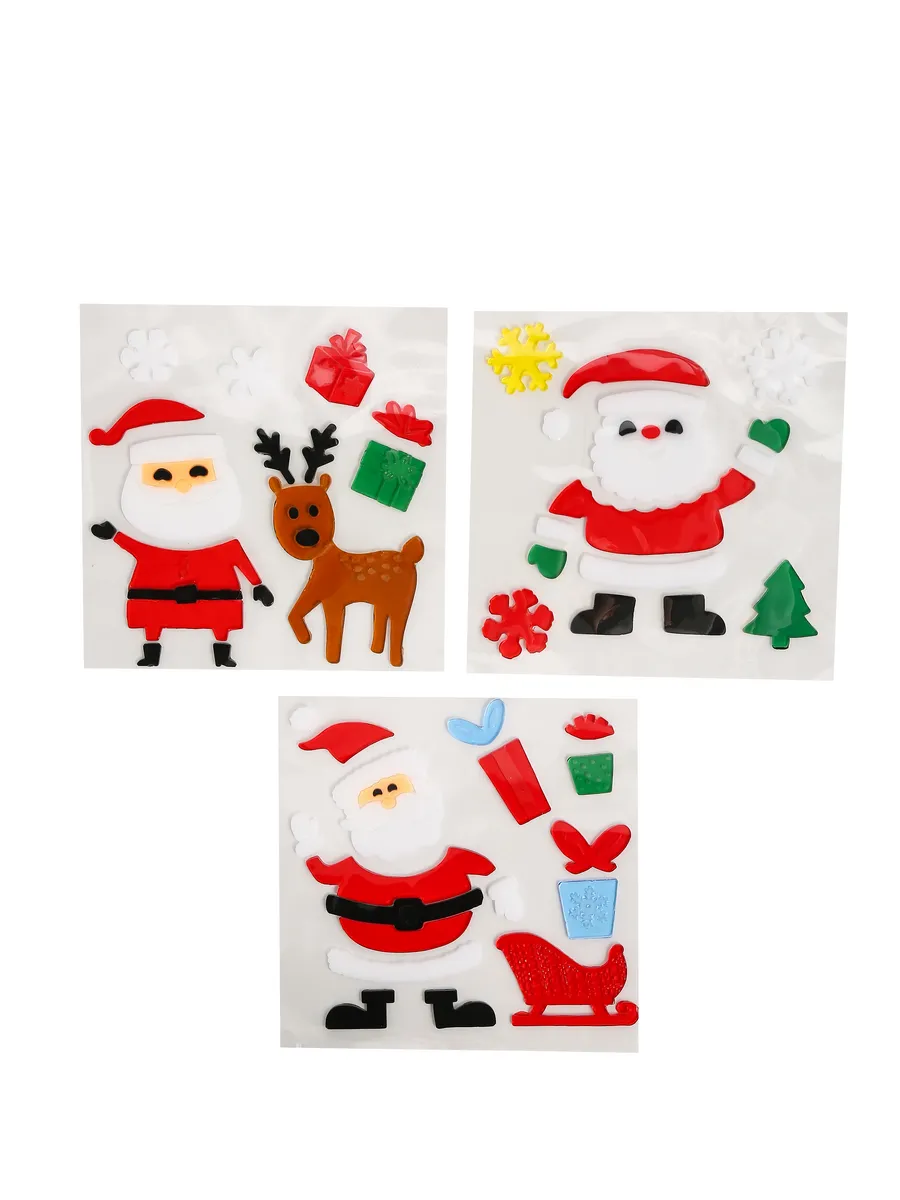 Наклейки новогодние гелевые Дед Мороз олень снеговик набор 3 шт