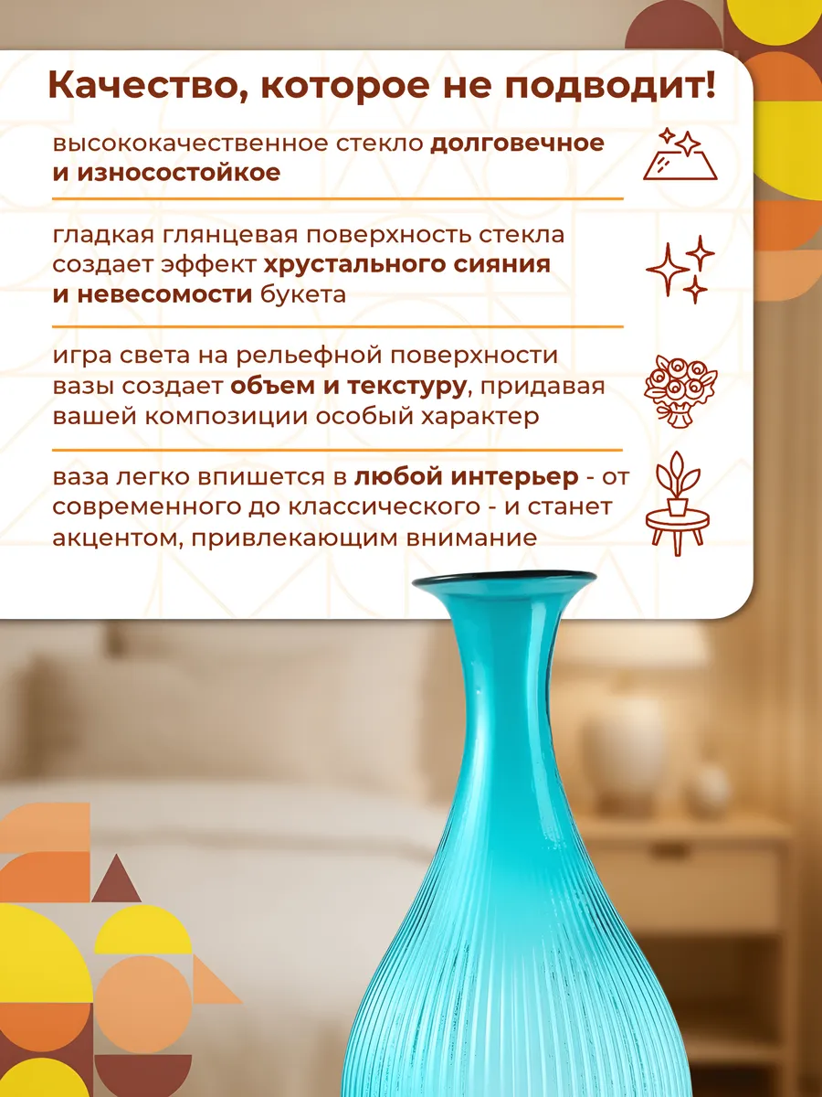 Изумрудно-бирюзовое стекло переливается на солнце, словно драгоценный камень, а рифлёная фактура создаёт завораживающую игру света и тени. Каждая линия этой интерьерной вазы продумана до мелочей — от изящного горлышка до устойчивого основания.