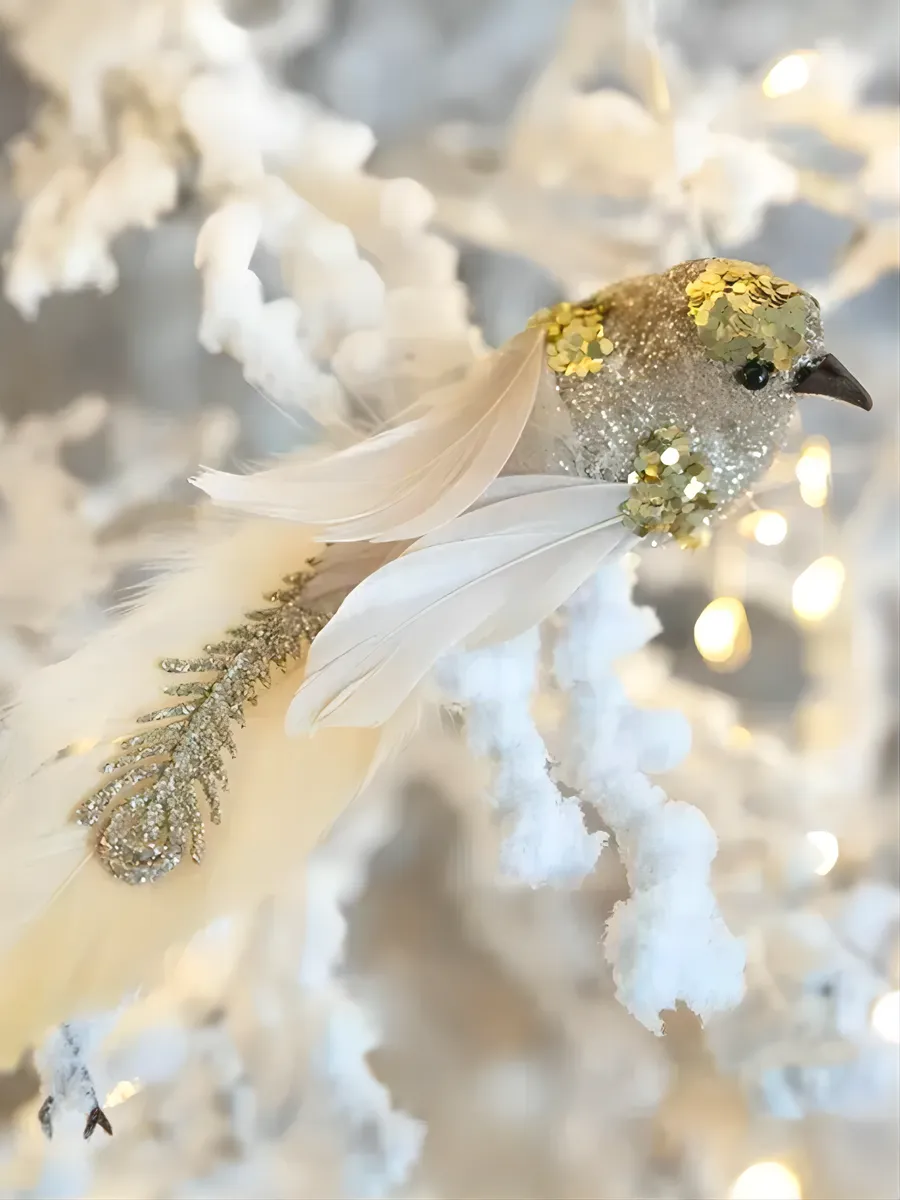 Каждая птичка словно покрыта звездной пылью — золотистые блестки и пайетки переливаются в свете гирлянд, создавая эффект драгоценного украшения. Нежные перья цвета слоновой кости развеваются при малейшем движении воздуха, оживляя композицию и наполняя её динамикой.