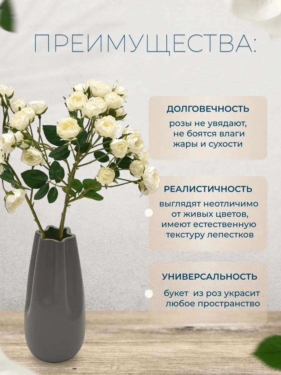 Именно то, что нужно для создания романтической атмосферы! Белые розы искусственные прекрасно впишутся в стиль прованс, классический или скандинавский интерьер. Поставьте их в высокую вазу в гостиной — и пространство мгновенно преобразится, наполнившись элегантностью и утончённостью.