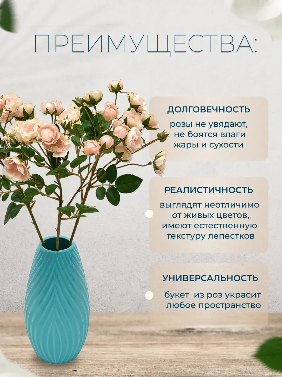 Эти искусственные розы также очень практичны. Ты можешь использовать их повторно, и они не требуют особого ухода. Просто протри их влажной тряпкой, и они снова будут выглядеть как новые! И не беспокойся о сезонности — эти розы доступны круглый год, так что ты можешь наслаждаться ими в любое время. Ты можешь использовать их как отдельный элемент декора или объединить с другими искусственными растениями, чтобы создать уникальную композицию.