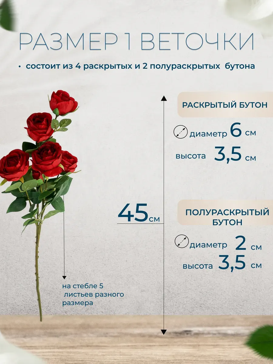 Одна ветка этих роз содержит несколько цветков, что делает их очень реалистичными и объемными. Ты можешь использовать их отдельно или объединить с другими цветами и зеленью, чтобы создать свой уникальный букет. А если ты хочешь добавить немного драматизма, то можешь использовать их в качестве центральной композиции на свадьбе или фотосессии. Эти розы также идеально подходят для декора дома, кухни или любой другой комнаты. Просто поставь их в вазу или контейнер, и они станут прекрасным дополнением к твоему интерьеру.