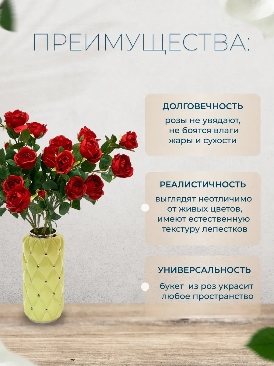 Итак, почему тебе необходимо купить эти искусственные цветы розы? Во-первых, они невероятно красивы и реалистичны. Во-вторых, они очень практичны и могут быть использованы повторно. В-третьих, они идеально подходят для любого случая, от свадьбы до фотосессии или просто как подарок. И самое главное — они добавят немного романтики и шика в твою жизнь!