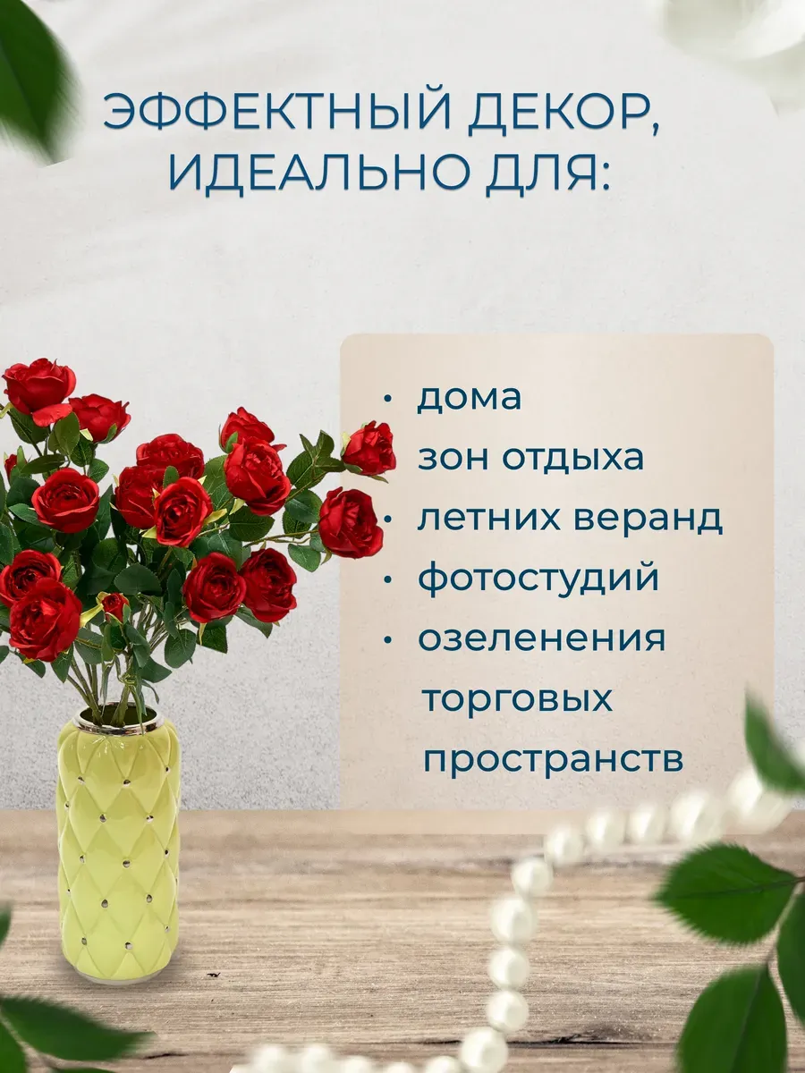 Эти искусственные розы также очень практичны. Ты можешь использовать их повторно, и они не требуют особого ухода. Просто протри их влажной тряпкой, и они снова будут выглядеть как новые! И не беспокойся о сезонности — эти розы доступны круглый год, так что ты можешь наслаждаться ими в любое время. Ты можешь использовать их как отдельный элемент декора или объединить с другими искусственными растениями, чтобы создать уникальную композицию.