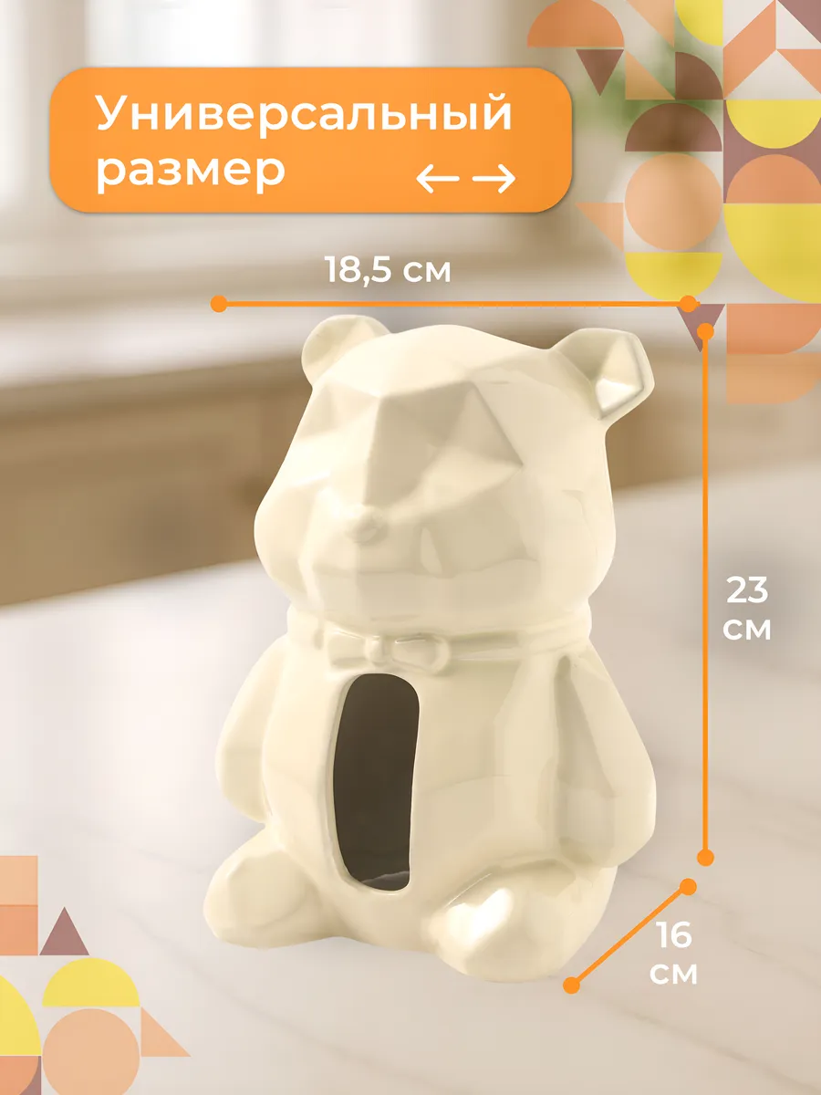 Прикоснитесь к гладкой глазурованной поверхности молочно-бежевого оттенка — словно шёлк под пальцами, прохладная керамика дарит ощущение премиального качества. Подставка для салфеток керамическая выполнена в форме очаровательного медведя с бантиком на шее, чьи геометричные грани создают игру света и тени, как в работах современных скульпторов. Эта салфетница настольная для кухни станет изюминкой интерьера в стиле минимализм, сканди или современной классики.