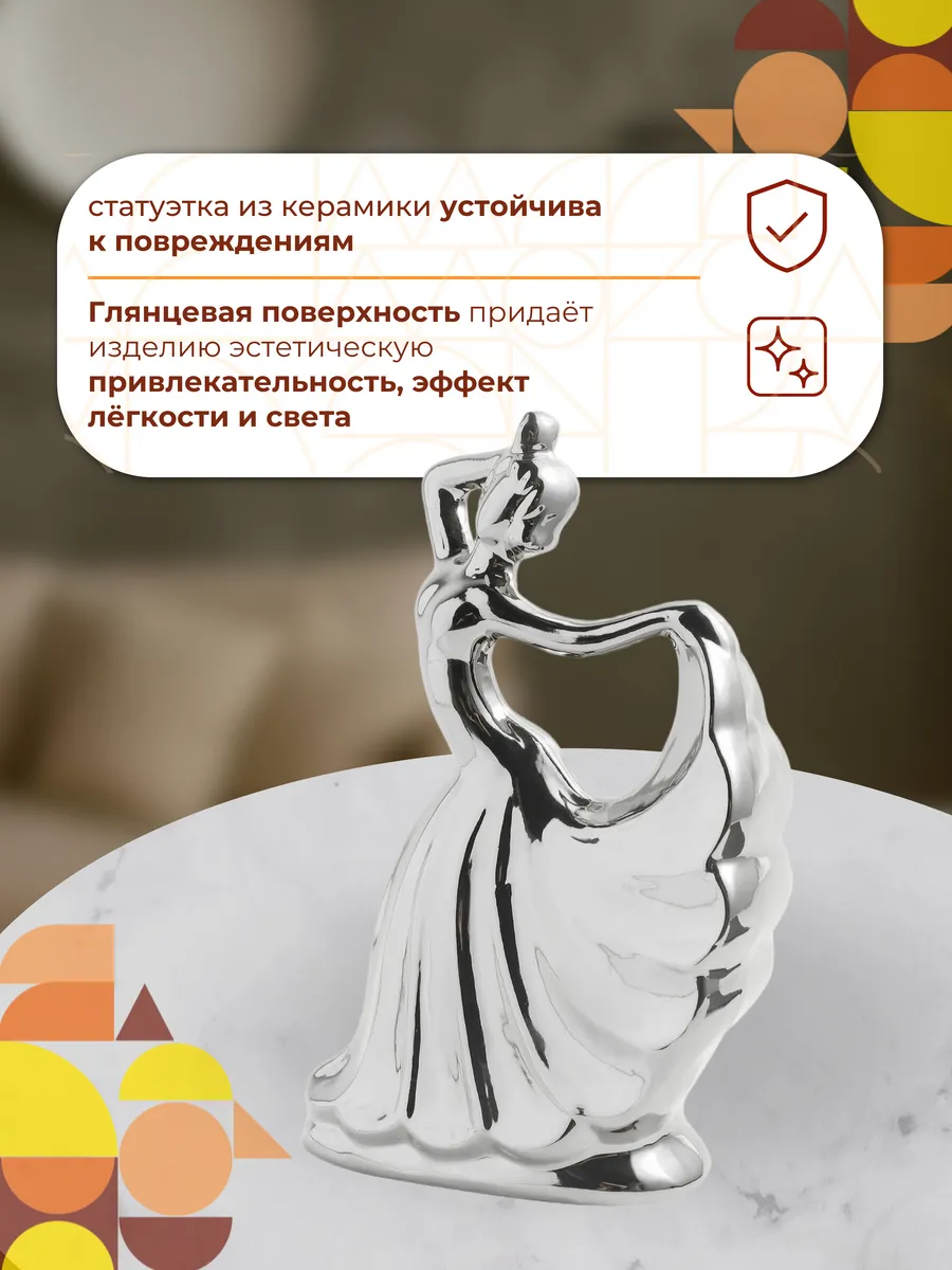 Прикоснитесь к зеркальной поверхности этой статуэтки балерины декоративной — и почувствуйте холодную гладкость премиальной керамики с серебряным покрытием. Развевающаяся юбка-пачка создаёт ощущение лёгкости и воздушности, словно танцовщица вот-вот оживёт. Фигурка танцовщицы серебристая отражает свет множеством бликов, создавая волшебную игру теней.
