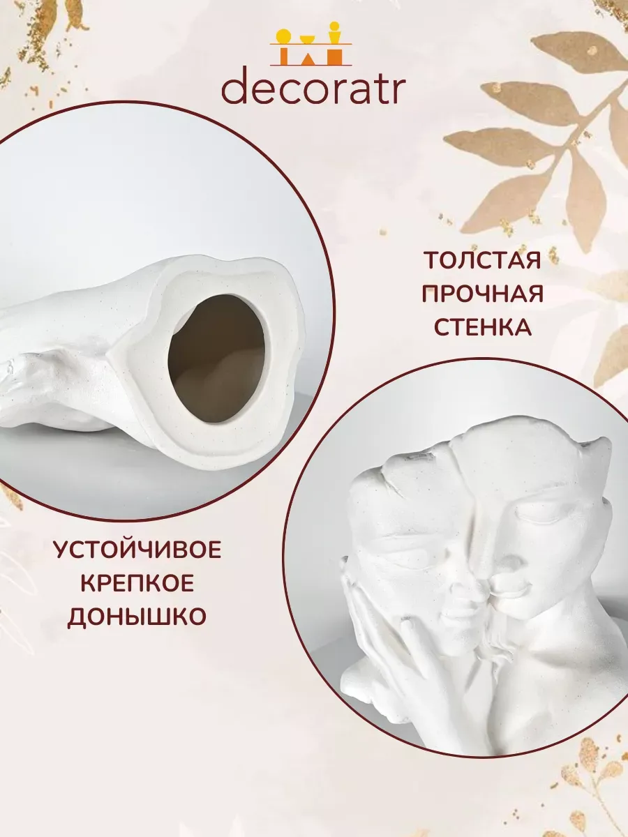 Изящная, с прочными стенками и устойчивым дном, эта интерьерная статуэтка в форме двух лиц привлекает внимание своим универсальным белым цветом и оригинальным дизайном.
