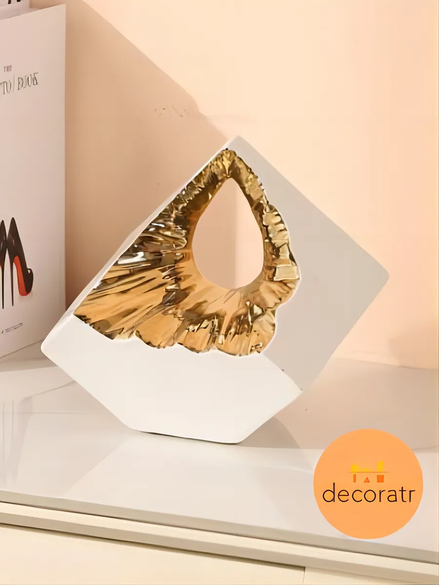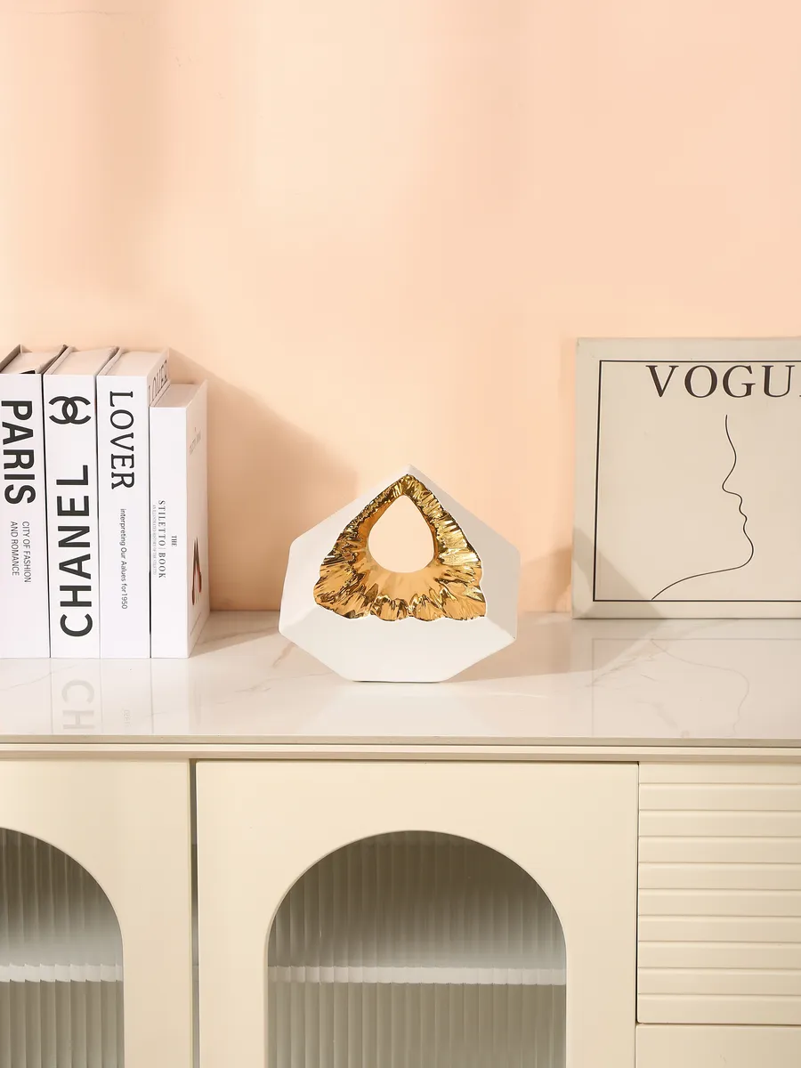 Эта интерьерная статуэтка выполнена в уникальном стиле современного минимализма с элементами арт-деко. Белоснежная керамическая основа контрастирует с золотистой внутренней поверхностью, создавая эффект драгоценного камня! Треугольная асимметричная форма с овальным отверстием внутри напоминает футуристический кристалл или космический портал — настолько необычна и притягательна эта композиция.