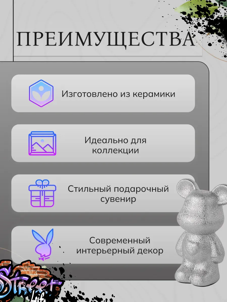Эта удивительная фигурка Bearbrick покрыта переливающейся серебристой глазурью, которая создаёт потрясающий эффект металлического блеска! Каждый луч света, падающий на поверхность, рождает новые оттенки — от нежного жемчужного до насыщенного стального. Прикоснувшись к гладкой поверхности, вы почувствуете приятную прохладу качественной керамики и безупречность каждой линии.