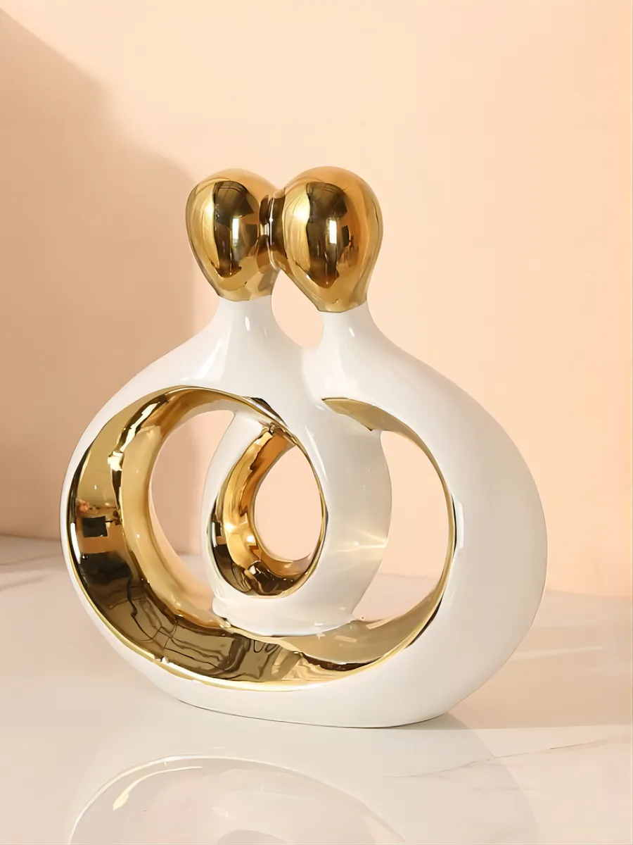 Абстрактная композиция из двух стилизованных голов/фигур, соединённых в центре золотым овальным кольцом. Округлые плавные формы создают ощущение мягкости и гармонии. Устойчивое основание обеспечивает стабильность.