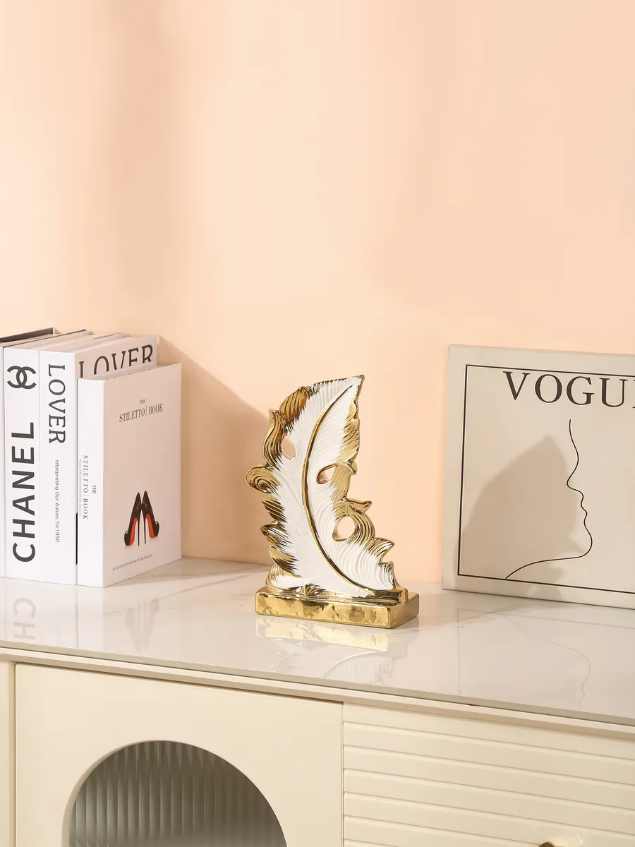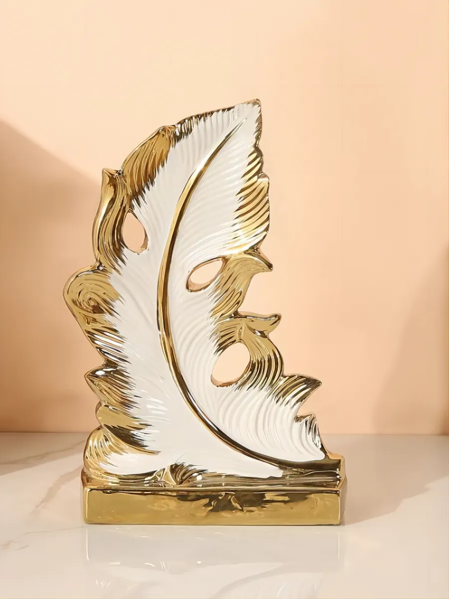 Керамические статуэтки для интерьера такого уровня — это инвестиция в атмосферу вашего дома. Изящная форма пера с тремя сквозными отверстиями создает удивительную игру света: солнечные лучи, проходя сквозь них, рисуют на стенах золотистые узоры. Рельефная поверхность с волнообразными линиями добавляет объем и динамику, а золотая статуэтка основания придает композиции завершенность и роскошь.