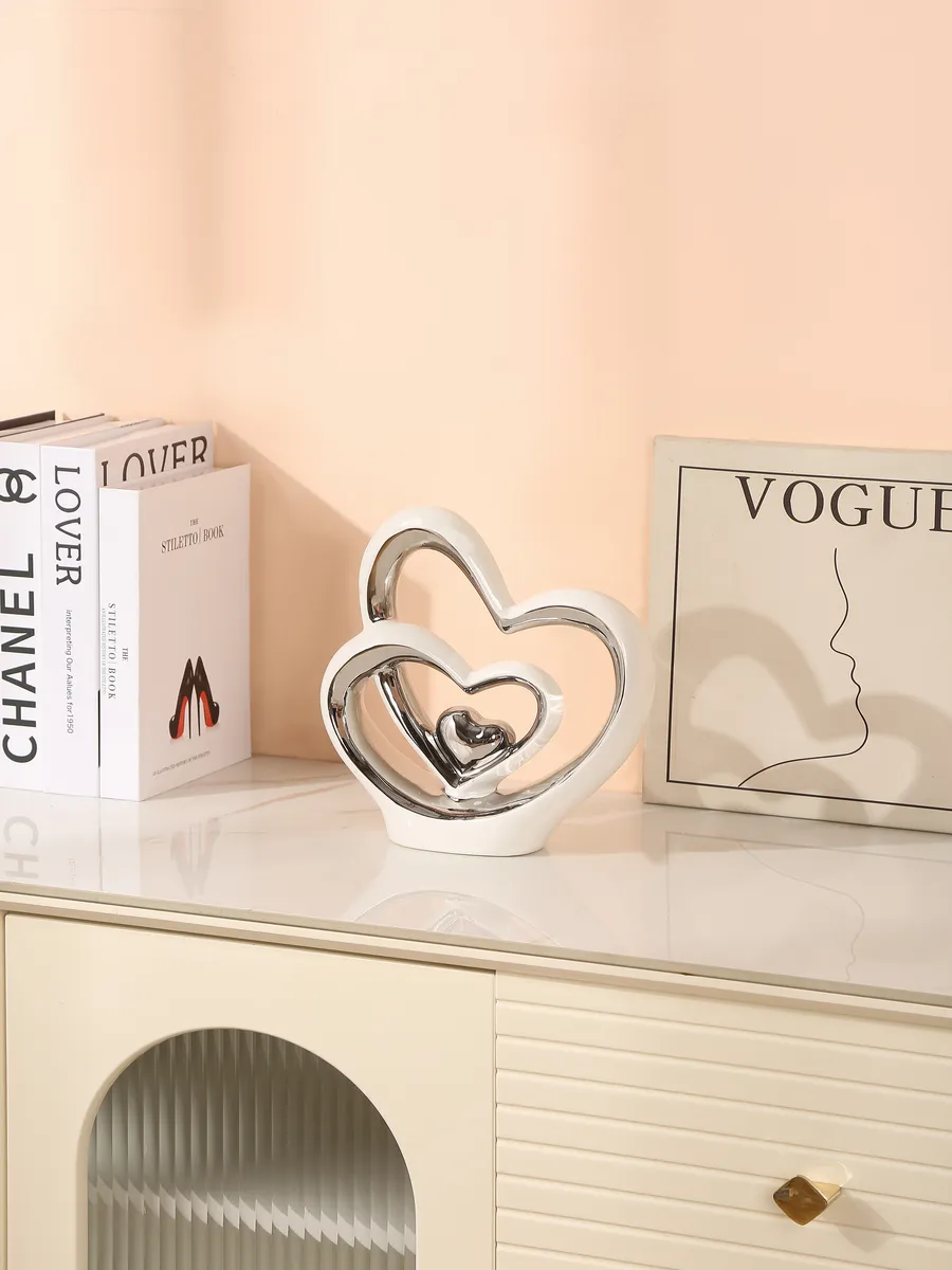 Керамические статуэтки для интерьера в форме сердца — это больше, чем просто декор. Это символ, который каждый день напоминает о главном. Три сердца разного размера, вложенные друг в друга, создают эффект бесконечности чувств. Зеркальная серебряная поверхность отражает окружающий мир, умножая красоту вашего дома. Статуэтка сердце керамическая на массивной белой подставке выглядит как арт-объект из галереи современного искусства.