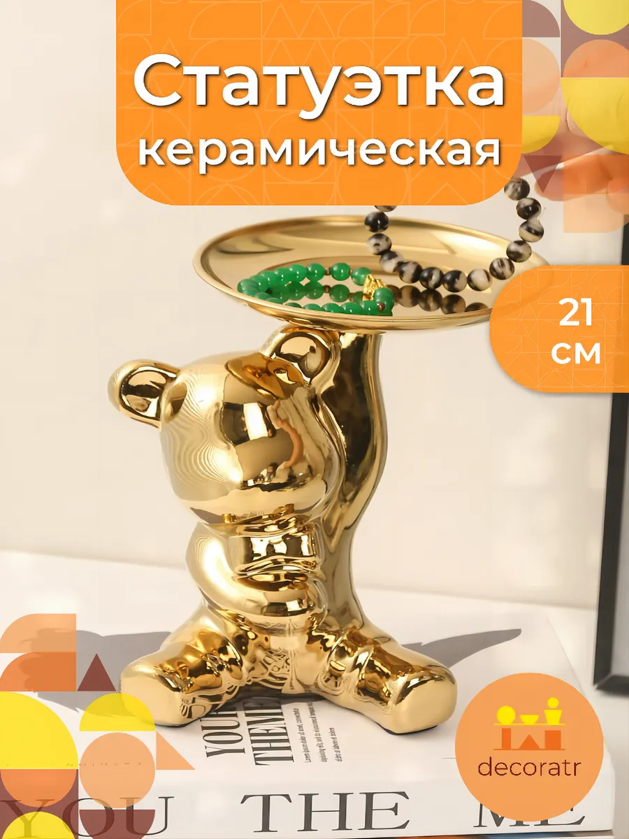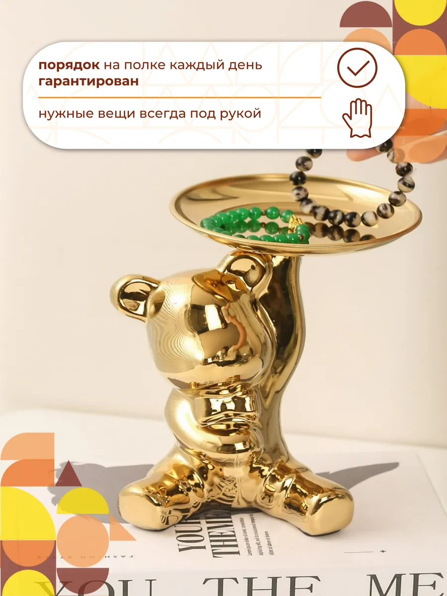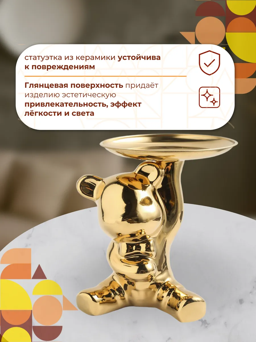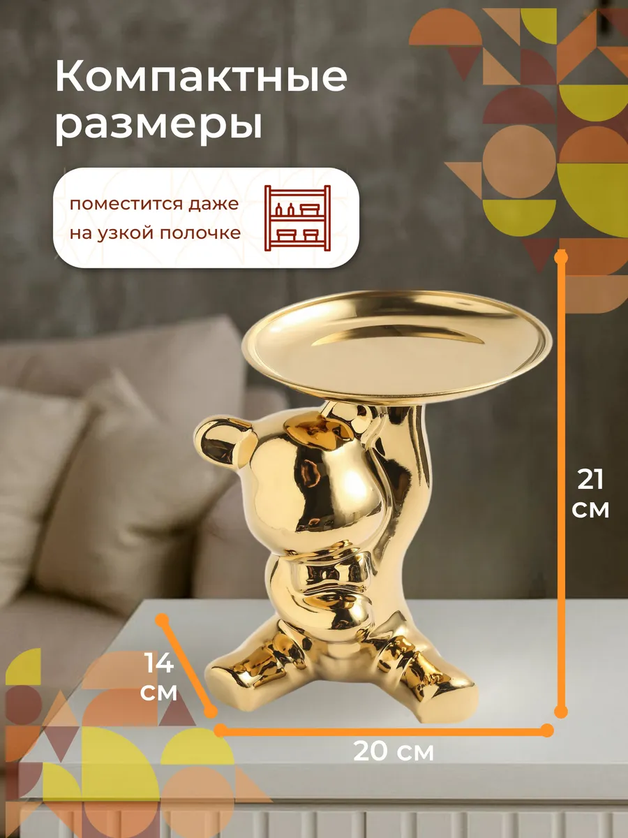 Статуэтка для интерьера золотого цвета выполнена в современной интерпретации поп-арт стиля. Фигура медведя с овальной подставкой-блюдом создаёт функциональную композицию — здесь можно хранить украшения, часы, ключи или мелкие аксессуары. Декоративная статуэтка медведь становится стильным органайзером и арт-объектом одновременно.