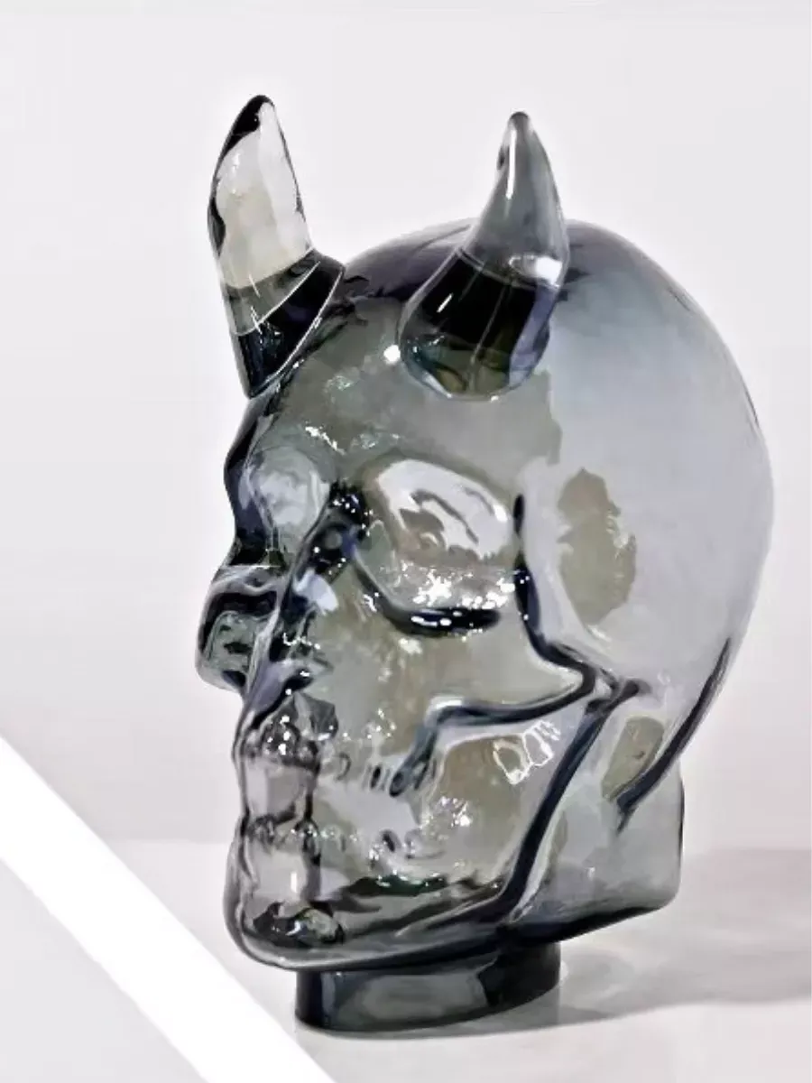 Декоративные элементы: Гладкая полированная поверхность стекла, анатомические детали черепа (глазницы, носовая полость, зубы), заострённые рога, игра света и тени в толще стекла
